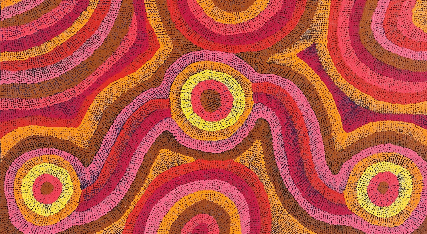 In contemporary Warlpiri paintings, traditional iconography is used to represent the ‘Jukurrpa’ (Dreaming), associated sites, and other elements. In many paintings of this Dreaming, short dashes are often used to represent ‘mangkurdu’ (cumulus & stratocumulus clouds), and longer, flowing lines represent ‘ngawarra’ (flood waters). Small circles are used to depict ‘mulju’ (soakages) and river beds.