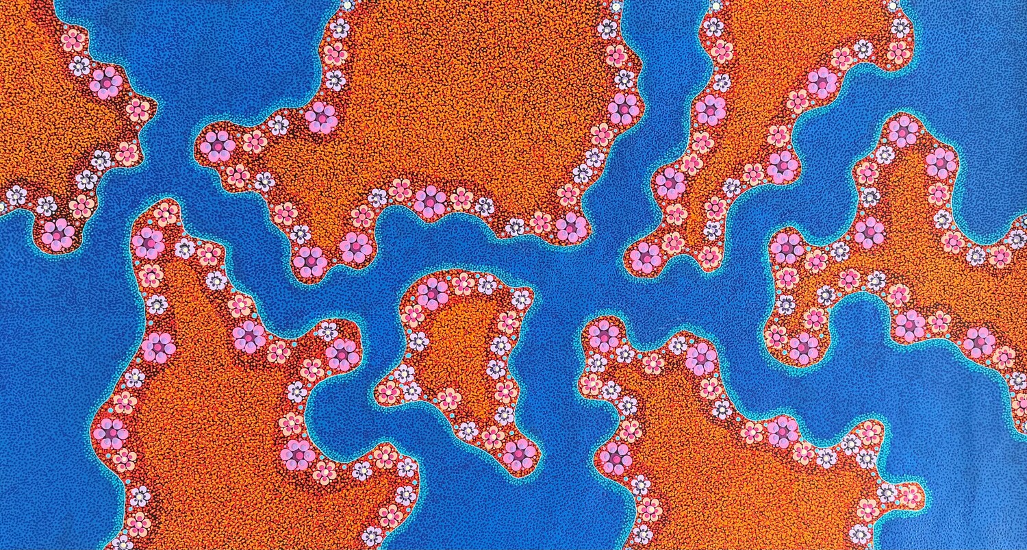 I like contemporary style with traditional input. As a contemporary artist I ask my family what I can paint. I like ochre colours, reds and oranges. I get the ideas of the bush colours by looking around. This represents Country, how Country blooms. Apart from the creek there are the deeper waterholes. ‘Through my painting, it really connects me to who I am. It strengthens my Aboriginality. I can pass it on to my kids and family connections. It brings my family together. When I was in Alice and painting it would all bring us together. My brothers would come around and they would sing to the paintings. Painting is good for my kids, it documents that historical kinship.”