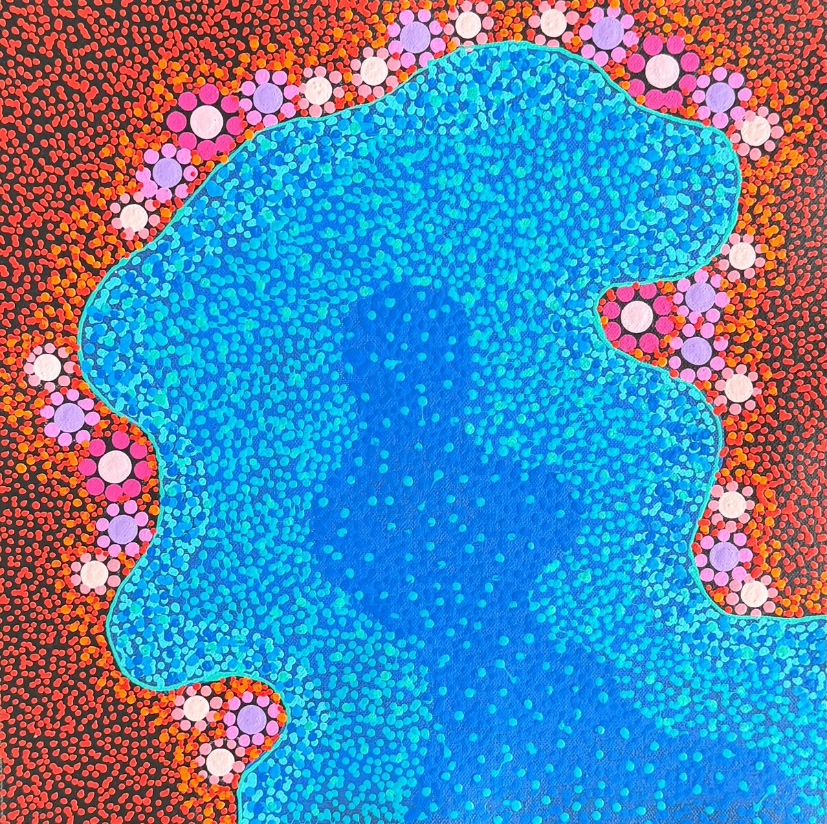 “I like using a contemporary style with traditional input. As a contemporary artist I ask my family what I can paint. I like ochre colours, reds and oranges. I get the ideas of the bush colours by looking around. This represents Country, how Country blooms. Apart from the creeks there are the deeper waterholes. Through my painting, it really connects me to who I am. It strengthens my Aboriginality. I can pass it on to my kids and create family connections. It brings my family together. When I was in Alice and painting, it would all bring us together. My brothers would come around and they would sing to the paintings. Painting is good for my kids, it documents that historical kinship.”