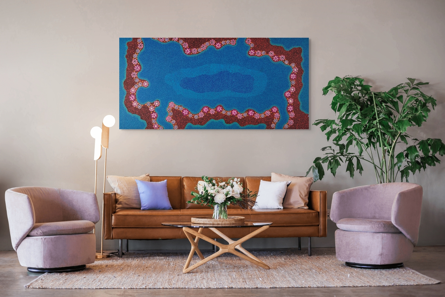 “I like using a contemporary style with traditional input. As a contemporary artist I ask my family what I can paint. I like ochre colours, reds and oranges. I get the ideas of the bush colours by looking around. This represents Country, how Country blooms. Apart from the creeks there are the deeper waterholes. Through my painting, it really connects me to who I am. It strengthens my Aboriginality. I can pass it on to my kids and create family connections. It brings my family together. When I was in Alice and painting, it would all bring us together. My brothers would come around and they would sing to the paintings. Painting is good for my kids, it documents that historical kinship.”