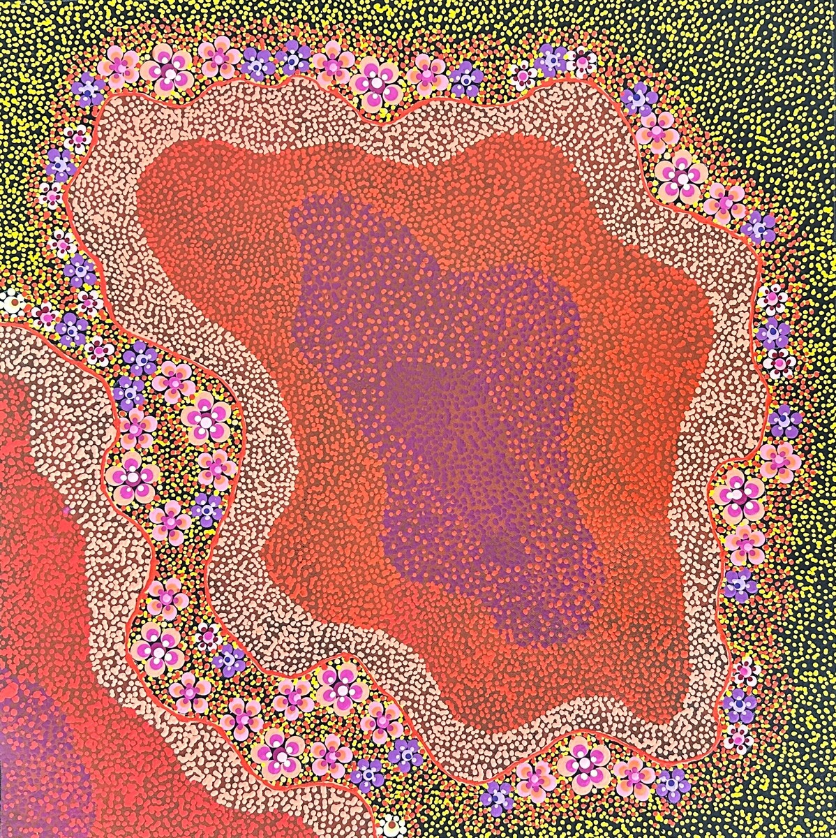 I like contemporary style with traditional input. As a contemporary artist I ask my family what I can paint. I like ochre colours, reds and oranges. I get the ideas of the bush colours by looking around. This represents Country, how Country blooms. Apart from the creek there are the deeper waterholes. ‘Through my painting, it really connects me to who I am. It strengthens my Aboriginality. I can pass it on to my kids and family connections. It brings my family together. When I was in Alice and painting it would all bring us together. My brothers would come around and they would sing to the paintings. Painting is good for my kids, it documents that historical kinship.”