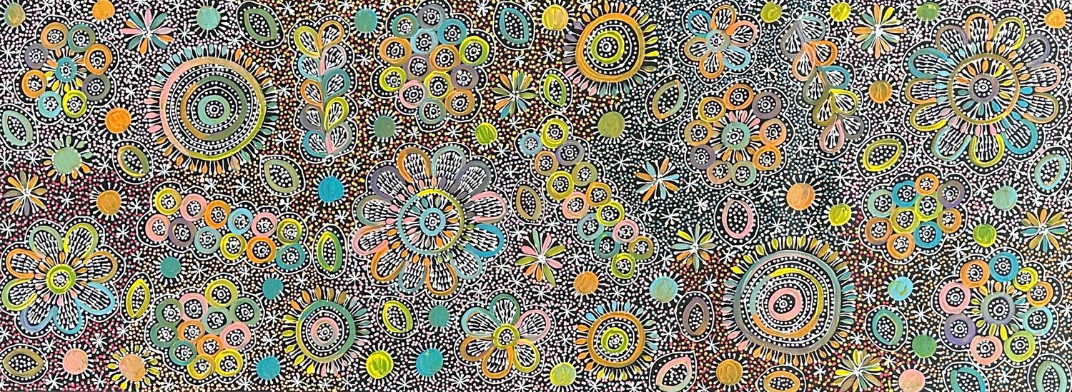 Belinda paints the leaves, flowers and Kame (pencil yam seeds). The Atnwelarre and Kame stories are very important Dreamtime stories for Belinda’s country and ceremonies by her people are performed to ensure its productivity as a food source and life form of the ancestors. Belinda uses dot work in this painting to represent the Kame.