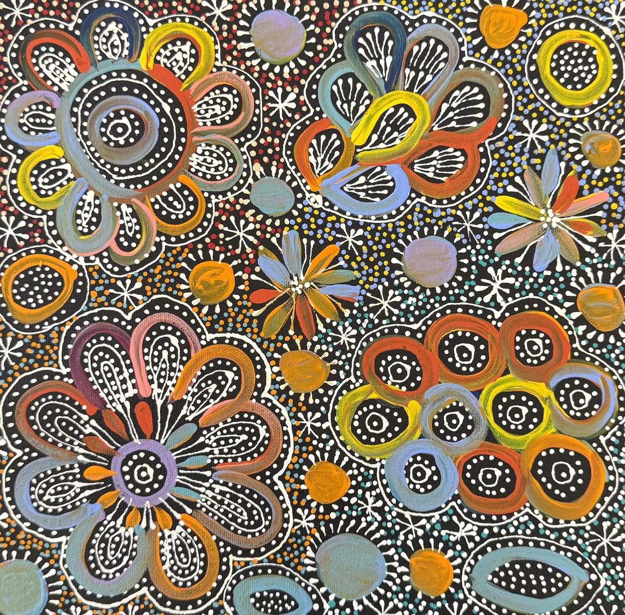 Belinda paints the leaves, flowers and Kame (pencil yam seeds). The Atnwelarre and Kame stories are very important Dreamtime stories for Belinda’s country and ceremonies by her people are performed to ensure its productivity as a food source and life form of the ancestors. Belinda uses dot work in this painting to represent the Kame.
