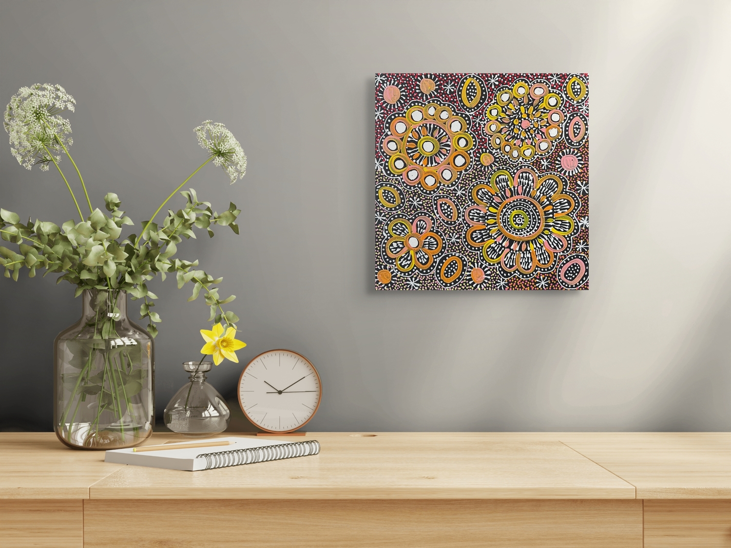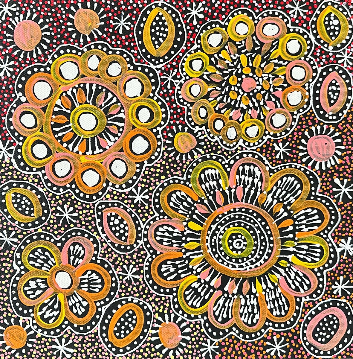 Belinda paints the leaves, flowers and Kame (pencil yam seeds). The Atnwelarre and Kame stories are very important Dreamtime stories for Belinda’s country and ceremonies by her people are performed to ensure its productivity as a food source and life form of the ancestors. Belinda uses dot work in this painting to represent the Kame.