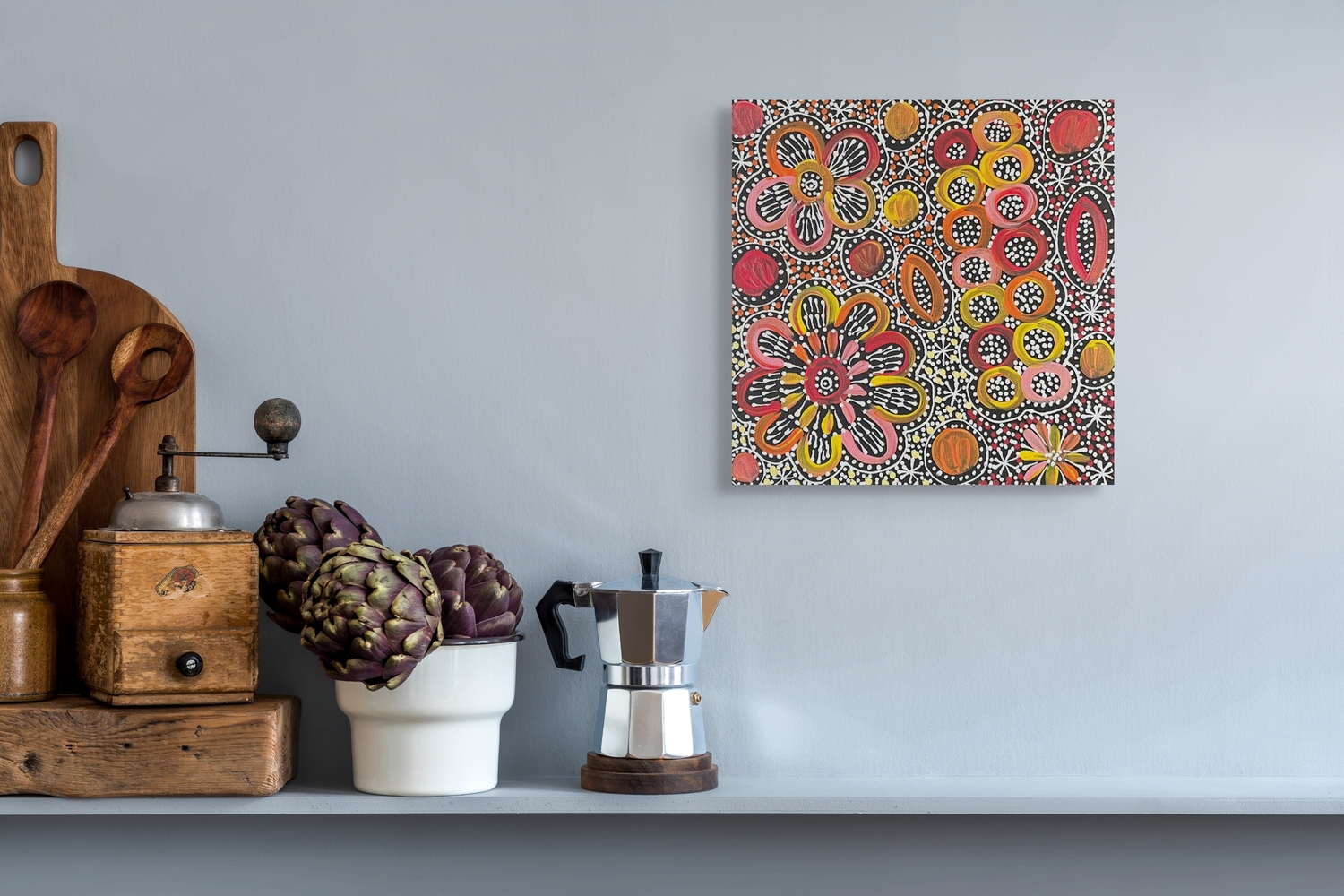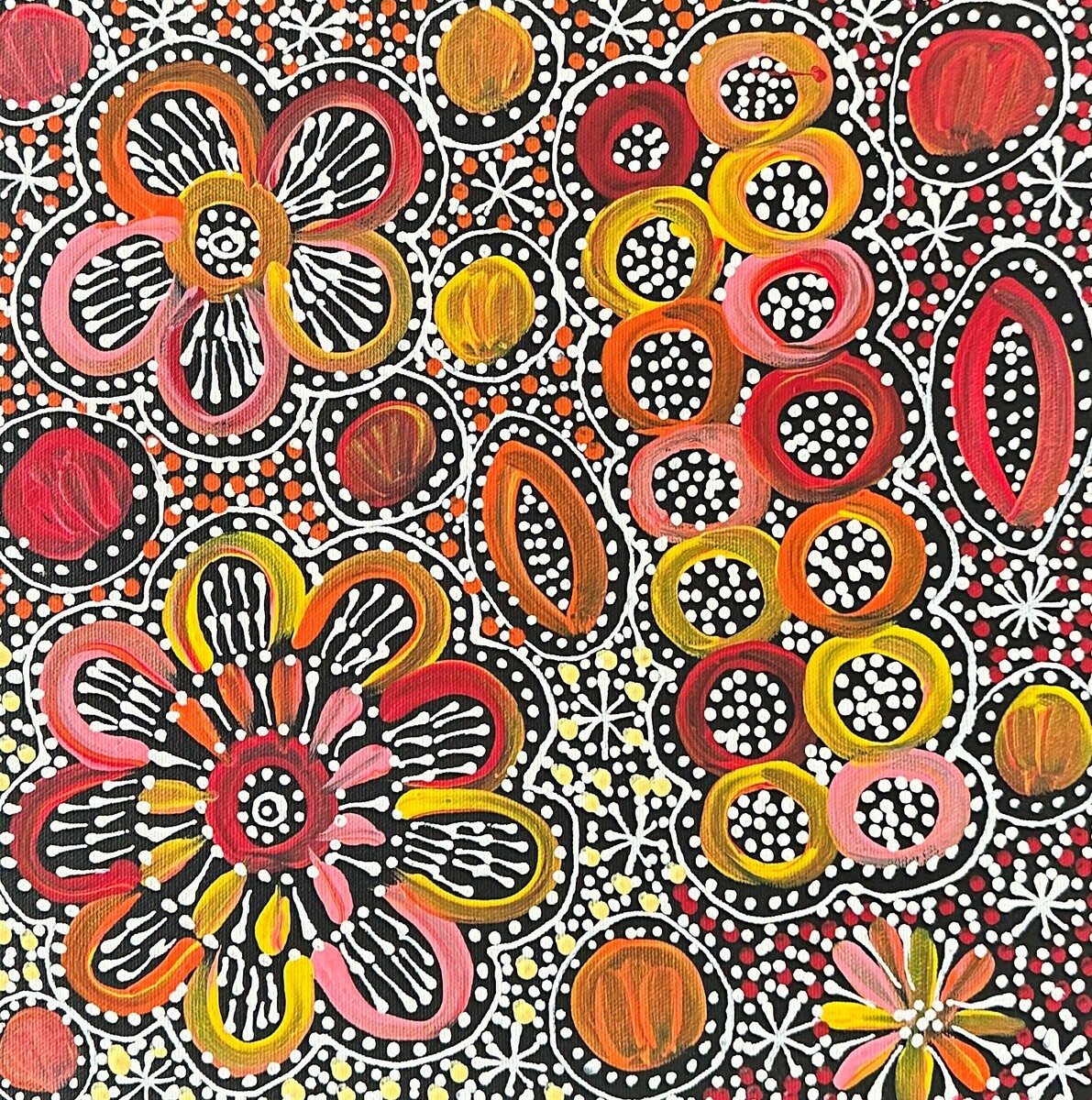 Belinda paints the leaves, flowers and Kame (pencil yam seeds). The Atnwelarre and Kame stories are very important Dreamtime stories for Belinda’s country and ceremonies by her people are performed to ensure its productivity as a food source and life form of the ancestors. Belinda uses dot work in this painting to represent the Kame.