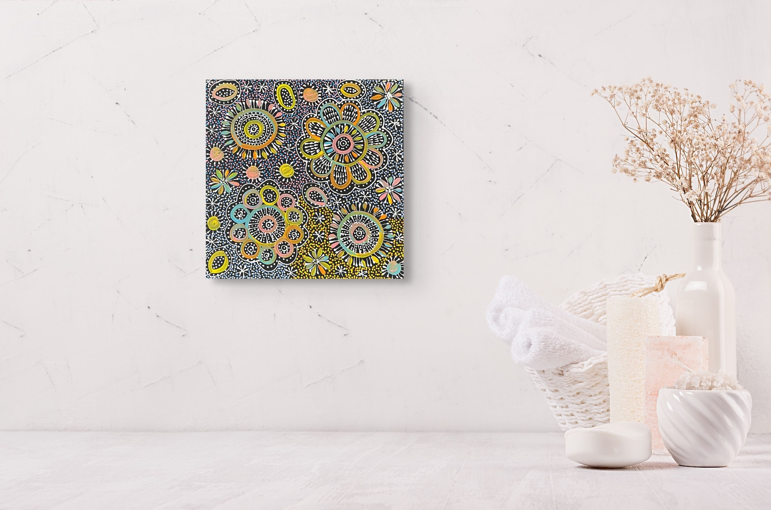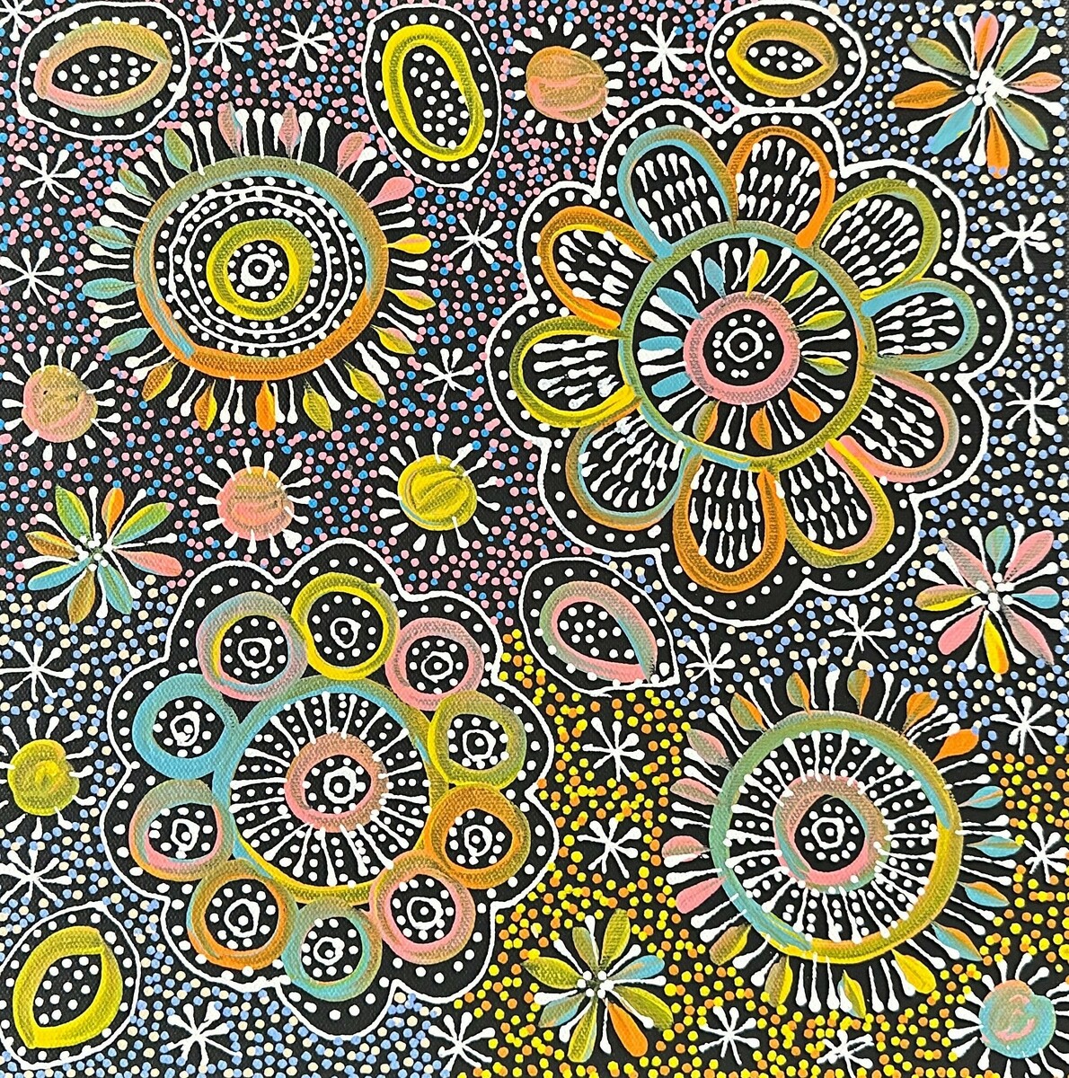 Belinda paints the leaves, flowers and Kame (pencil yam seeds). The Atnwelarre and Kame stories are very important Dreamtime stories for Belinda’s country and ceremonies by her people are performed to ensure its productivity as a food source and life form of the ancestors. Belinda uses dot work in this painting to represent the Kame.