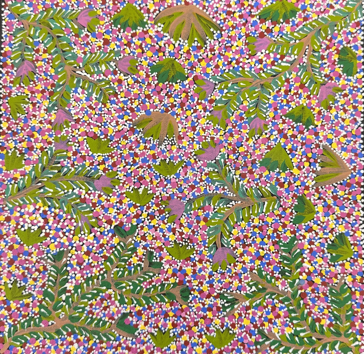 There are many sacred Dreamtime stories that belong to Bettrina’s country of which play a significant part in her ceremonies and culture. One of her main Dreamings is the story of Bush Medicine which she has depicted in this painting. In the ‘olden days’ the leaves and the seeds of this plant were gathered, ground and mixed with animal fat (today a commercial oil is used) and it is then used as an ointment or boiled in water for medicinal use. In this painting, dot work represents the bush medicine seeds.