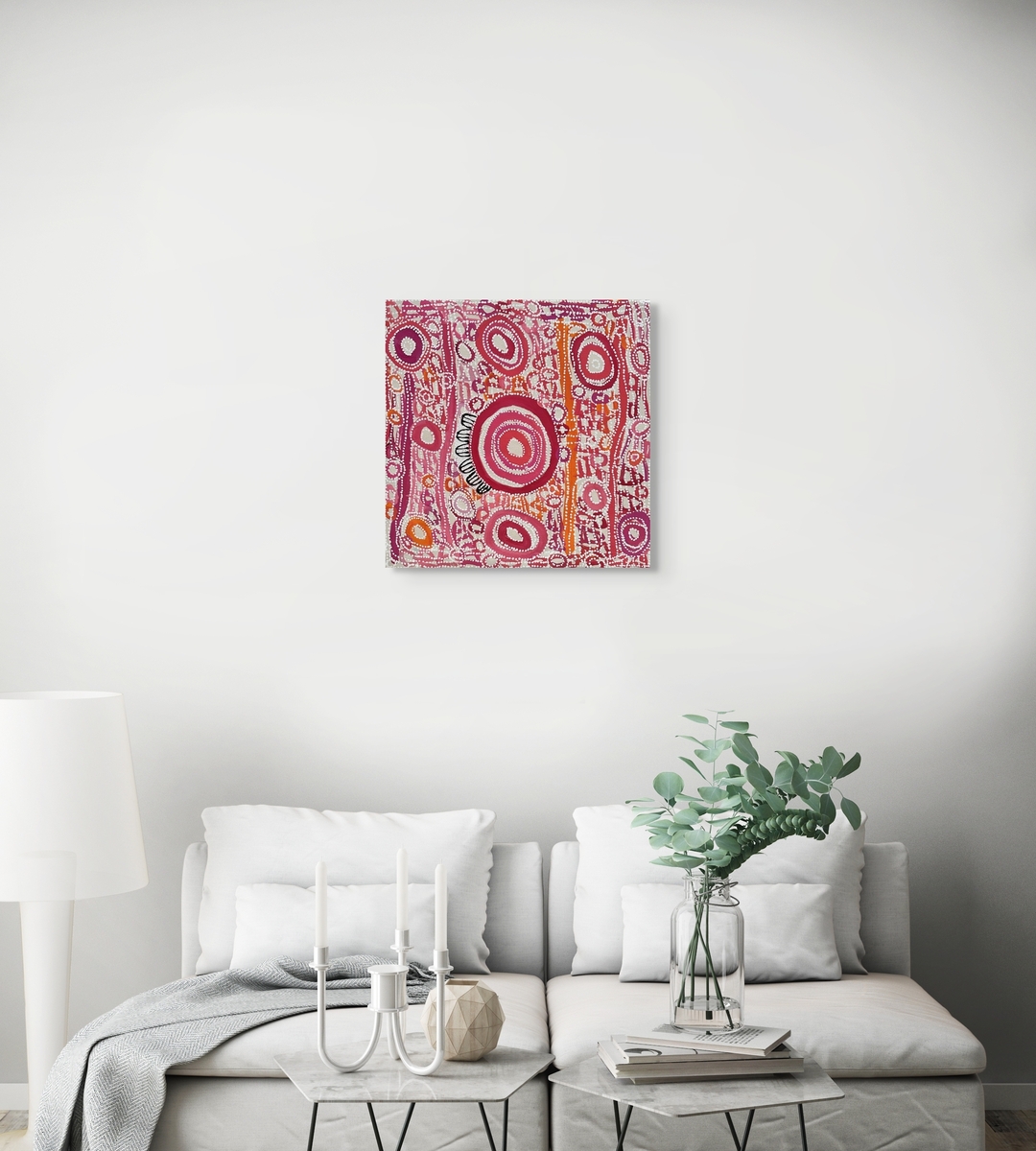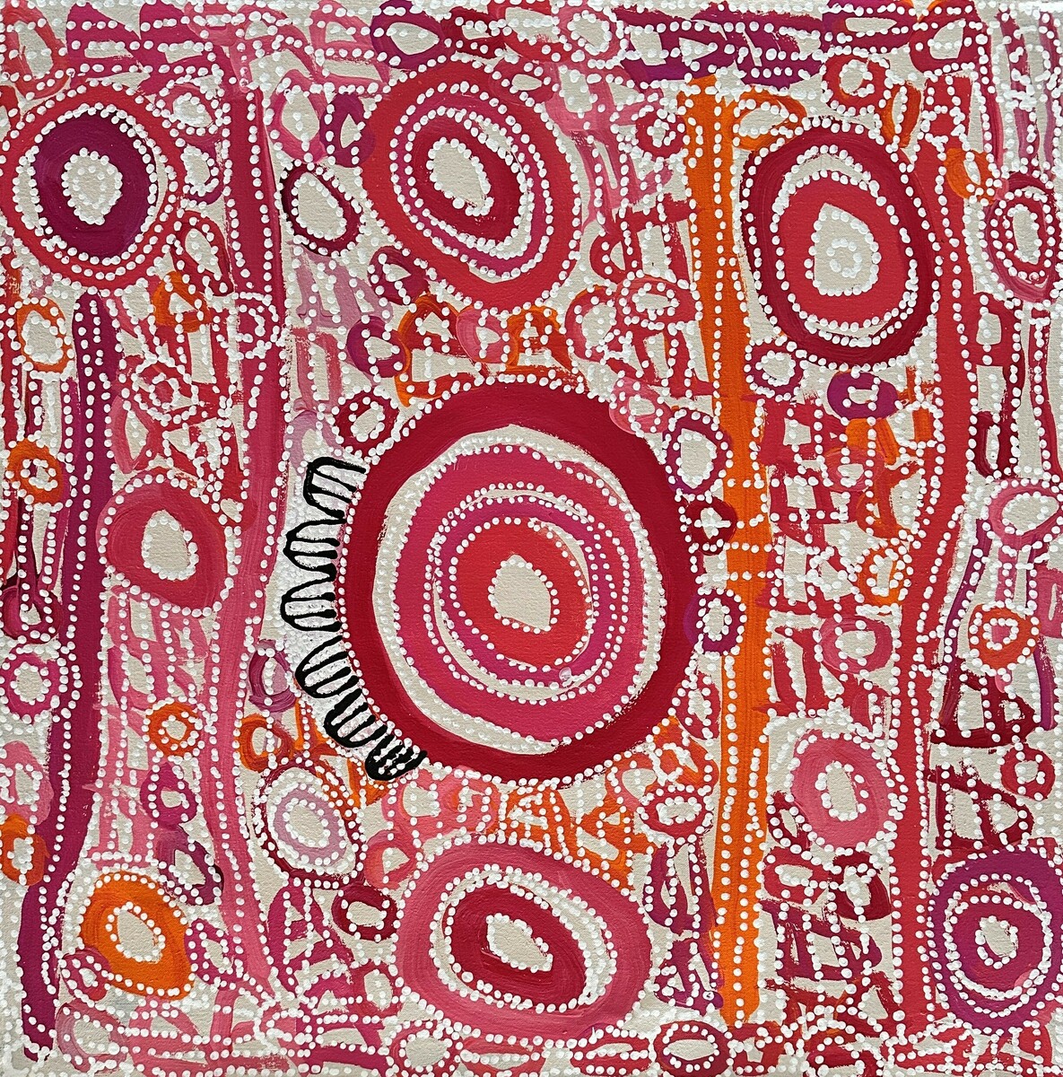 Charmaine paints Awelye (women’s ceremonial body paint designs) for the ancestral dreamtime stories which belong to her country, Atnwengerrp, in the Utopia Region. Atnwengerrp is also her mother and grandmother’s country.