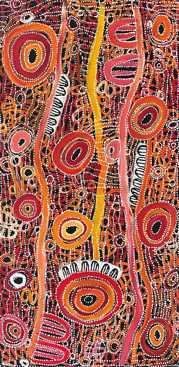 The bold linear designs in this painting represent awelye. These designs are painted onto the chest, breasts, arms and thighs. Powders ground from red and yellow ochre (clays), charcoal and ash are used as body paint and applied with a flat stick with soft padding. The women sing the songs associated with their awelye as each woman takes her turn to be ‘painted-up’. Women perform awelye ceremonies to demonstrate respect for their country and the total well-being and health of their community.