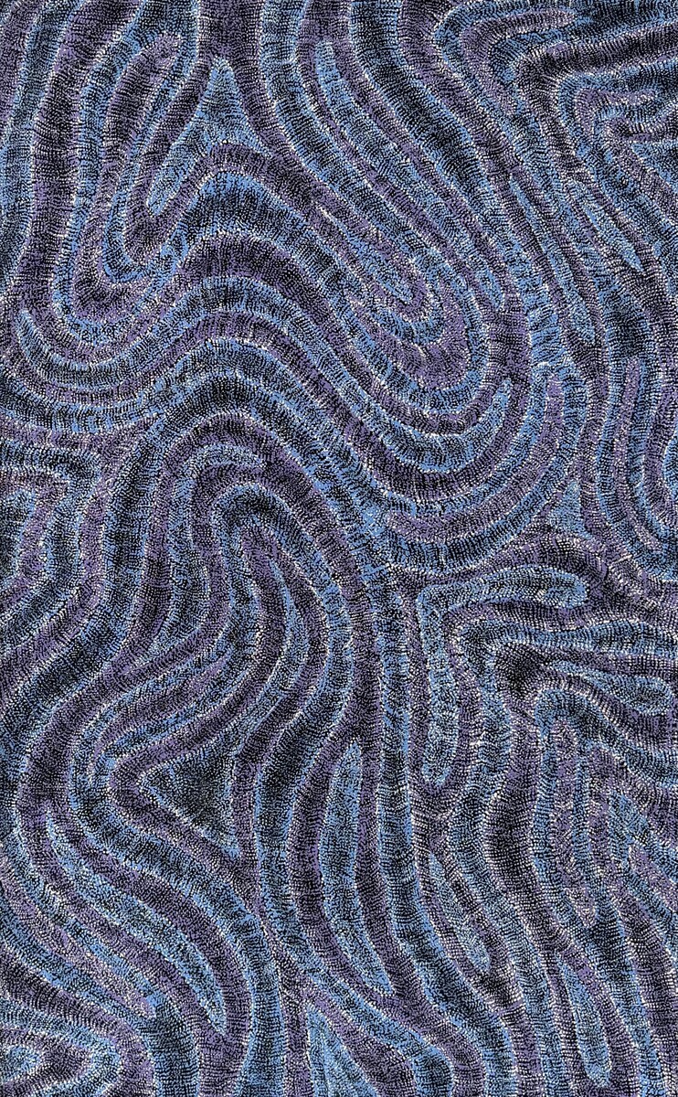 The Wanakiji Jukurrpa (bush tomato [Solanum chippendalei] Dreaming) travels through Yaturlu (near Mount Theo, north of Yuendumu). “Wanakiji” grows in open spinifex country and is a small, prickly plant with purple flowers that bears green fleshy fruit with many small black seeds. After collecting the fruit the seeds are removed with a small wooden spoon called ‘kajalarra’ . The fruit then can be eaten raw or threaded onto skewers called ‘turlturrpa’ and then cooked over a fire. ‘Wanakiji’ can also be skewered and left to dry. When they are prepared in this way it is called ‘turlturrpa’ and the fruit can be kept for a long time. In contemporary Warlpiri paintings traditional iconography is used to represent the Jukurrpa, particular sites and other elements. The Wanakiji Jukurrpa belongs to Napanangka/Napangardi women and Japanangka/Japangardi men.