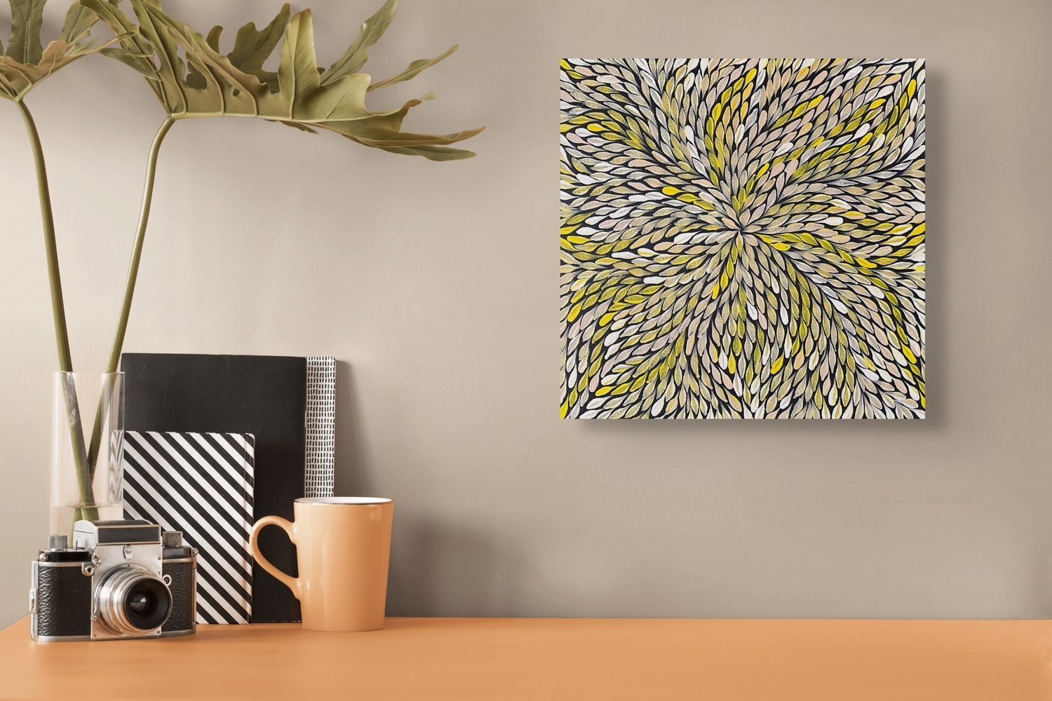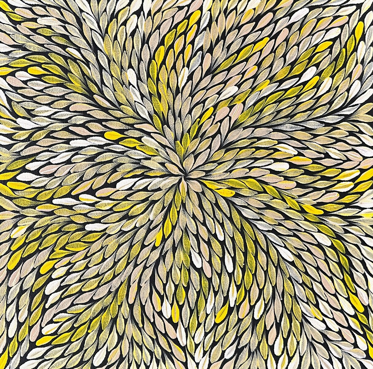 Atnwelarr, the pencil yam, and Kame, the seed of this plant, are the subject of Delvine’s painting. The Dreamtime stories for both of these belong to Delvine’s country Alhalkere in the Utopia Region, North East of Alice Springs. The Atnwelarr is a trailing herb or creeper, sometimes covering large areas, with bright green leaves, yellow flowers and long skinny yams (swollen roots). These are an important food source which can be eaten raw or cooked in hot sand and ashes.