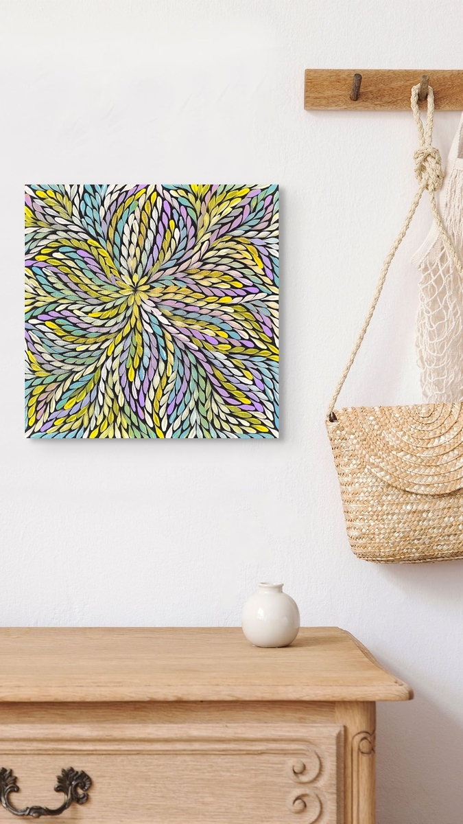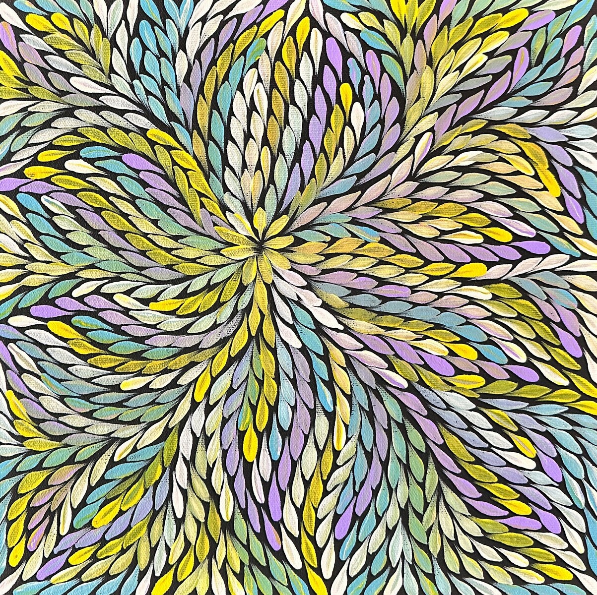Atnwelarr, the pencil yam, and Kame, the seed of this plant, are the subject of Delvine’s painting. The Dreamtime stories for both of these belong to Delvine’s country Alhalkere in the Utopia Region, North East of Alice Springs. The Atnwelarr is a trailing herb or creeper, sometimes covering large areas, with bright green leaves, yellow flowers and long skinny yams (swollen roots). These are an important food source which can be eaten raw or cooked in hot sand and ashes.