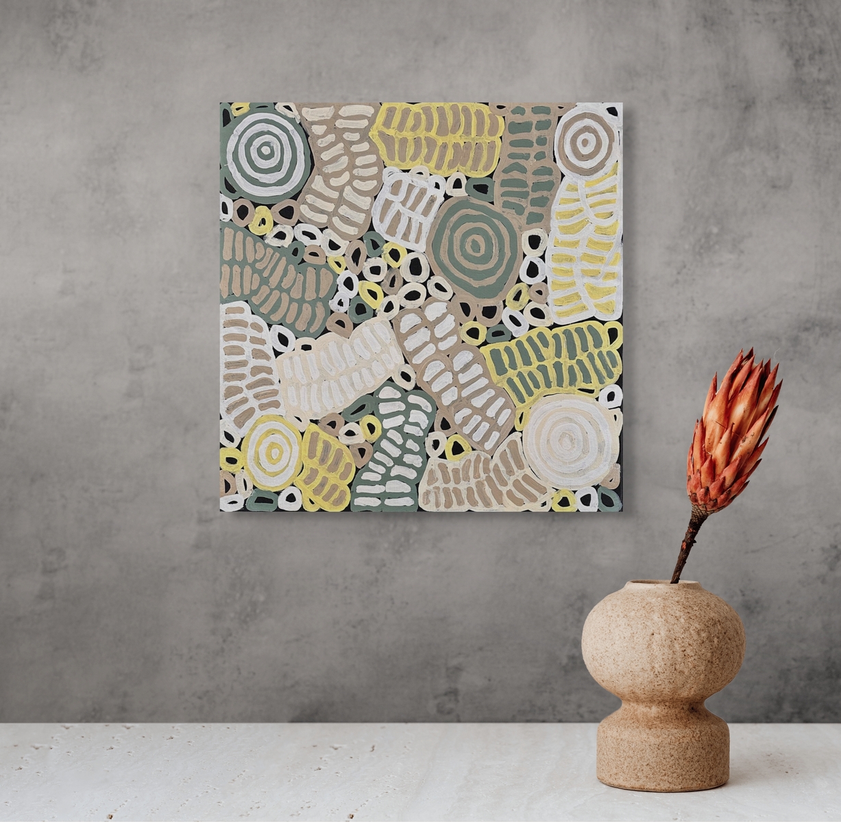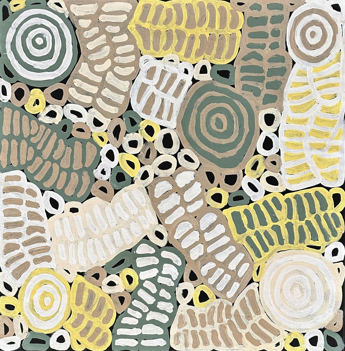 The bold linear pattern of stripes and curves throughout Dora’s painting illustrates the Awelye. After smearing their bodies with animal fat, the women trace these designs onto their breasts, arms and thighs, singing as each woman takes her turn to be ‘painted-up’. Their songs relate to the dreamtime stories of ancestral travel, dance and other totemic plants, animals and natural forces. Awelye demonstrates respect for the land. In performing these ceremonies they ensure well-being and happiness within their communities. The concentric circles underneath this painting represent the waterholes. The small circles depict the Anemangkerr.