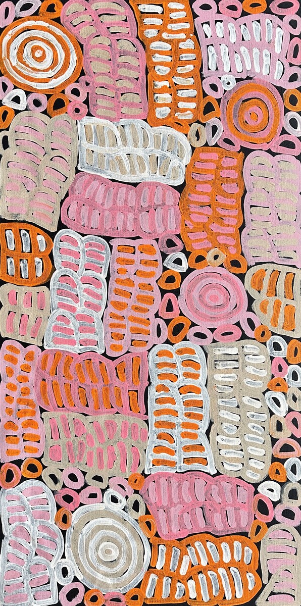 The bold linear pattern of stripes and curves throughout Dora’s paintings illustrate the Awelye. After smearing their bodies with animal fat, the women trace these designs onto their breasts, arms and thighs, singing as each woman takes her turn to be ‘painted-up’. Their songs relate to the dreamtime stories of ancestral travel, dance and other totemic plants, animals and natural forces. Awelye demonstrates respect for the land. In performing these ceremonies, they ensure well-being and happiness within their communities.