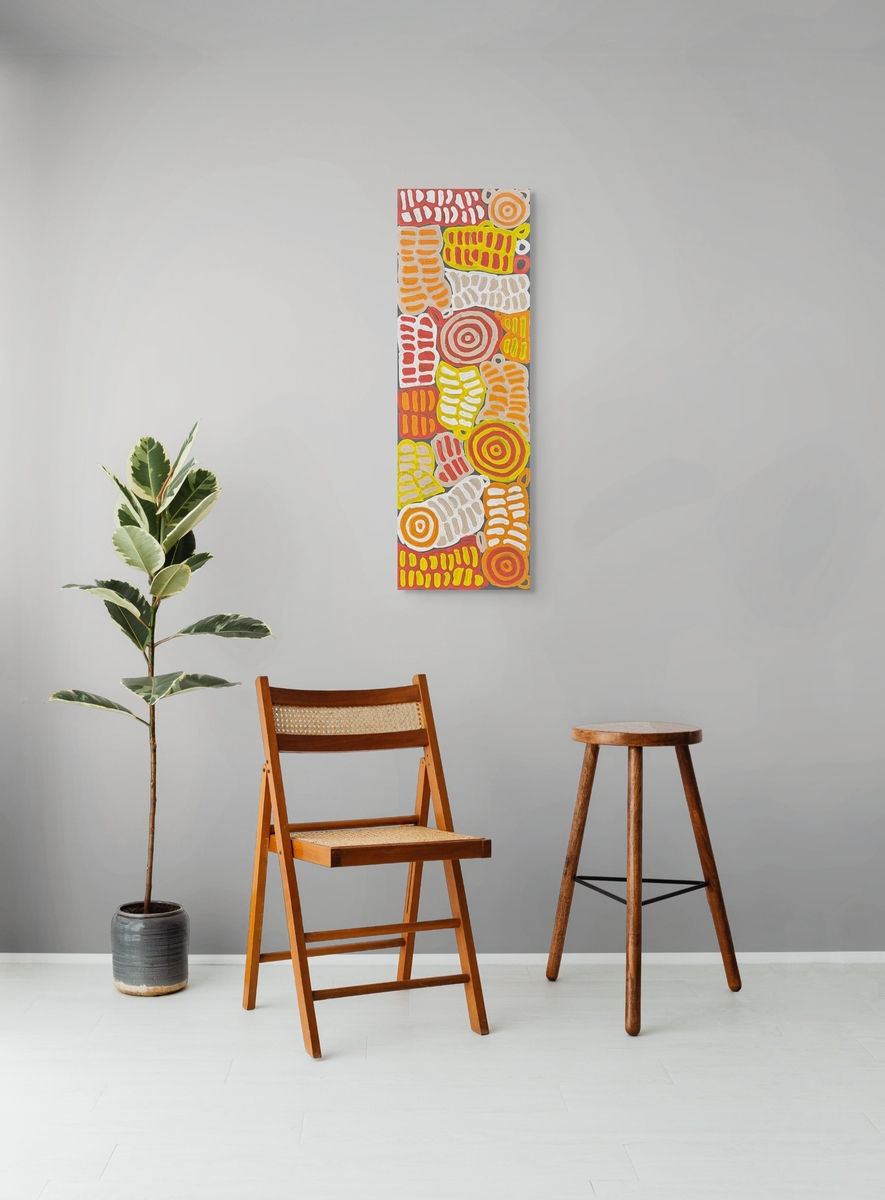 The bold linear pattern of stripes and curves throughout Dora’s painting illustrates the Awelye. After smearing their bodies with animal fat, the women trace these designs onto their breasts, arms and thighs, singing as each woman takes her turn to be ‘painted-up’. Their songs relate to the dreamtime stories of ancestral travel, dance and other totemic plants, animals and natural forces. Awelye demonstrates respect for the land. In performing these ceremonies they ensure well-being and happiness within their communities. The concentric circles underneath this painting represent the waterholes. The small circles depict the Anemangkerr.