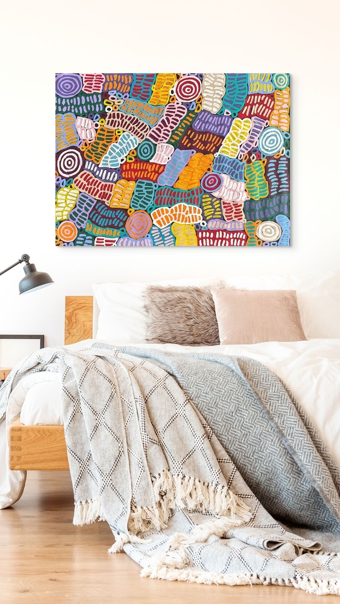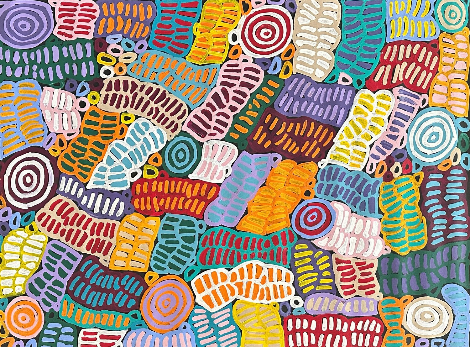 The bold linear pattern of stripes and curves throughout Dora’s painting illustrates the Awelye. After smearing their bodies with animal fat, the women trace these designs onto their breasts, arms and thighs, singing as each woman takes her turn to be ‘painted-up’. Their songs relate to the dreamtime stories of ancestral travel, dance and other totemic plants, animals and natural forces. Awelye demonstrates respect for the land. In performing these ceremonies they ensure well-being and happiness within their communities. The concentric circles underneath this painting represent the waterholes. The small circles depict the Anemangkerr.