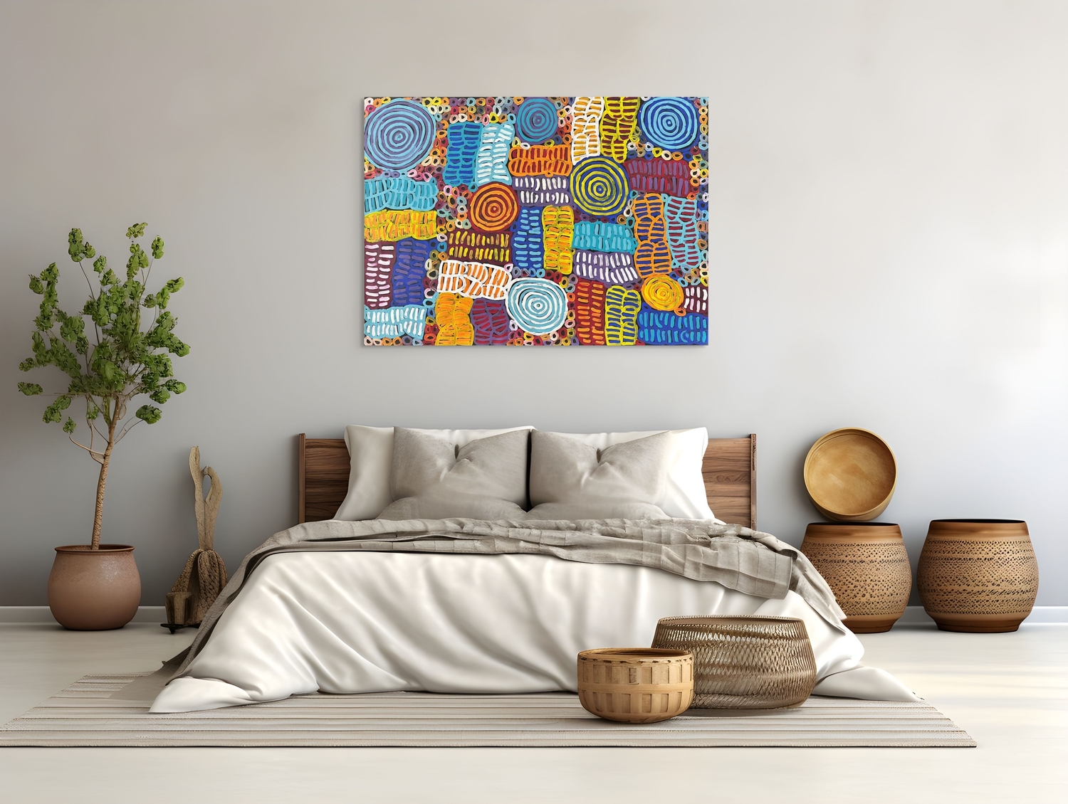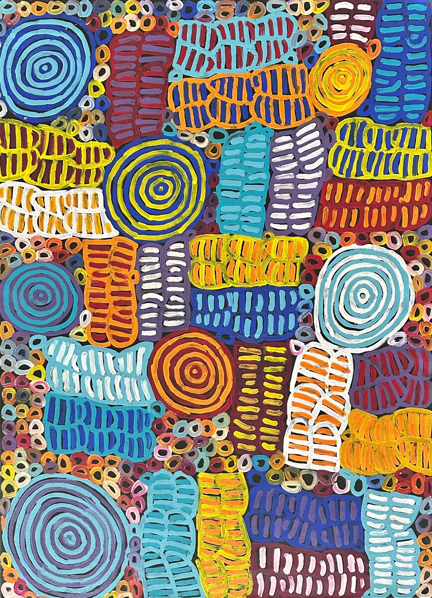 The bold linear pattern of stripes and curves throughout Dora’s painting illustrates the Awelye. After smearing their bodies with animal fat, the women trace these designs onto their breasts, arms and thighs, singing as each woman takes her turn to be ‘painted-up’. Their songs relate to the dreamtime stories of ancestral travel, dance and other totemic plants, animals and natural forces. Awelye demonstrates respect for the land. In performing these ceremonies they ensure well-being and happiness within their communities. The concentric circles underneath this painting represent the waterholes. The small circles depict the Anemangkerr.