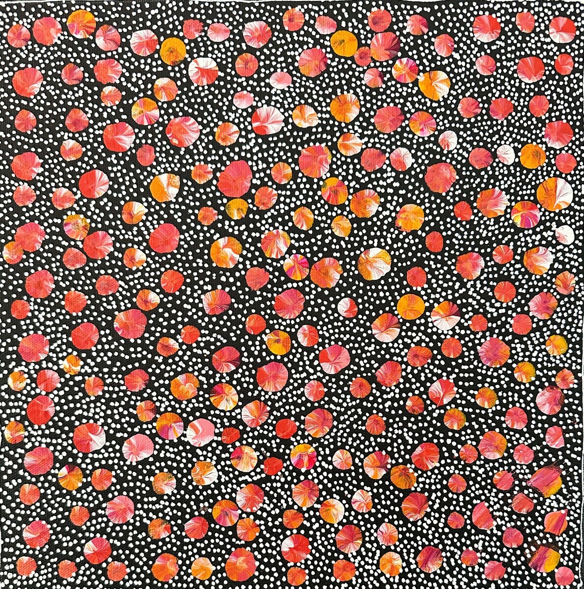 The designs in Eileen’s painting are influenced by the Arlatyeye (Pencil Yam) Story belonging to her country, Denipa Station.