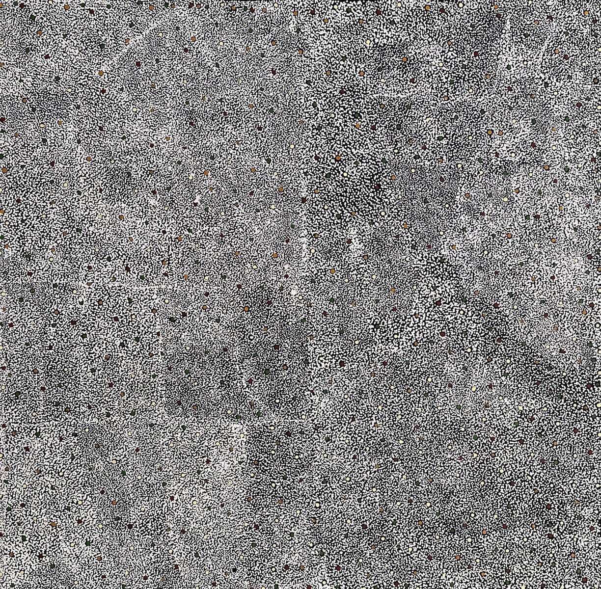 Elizabeth paints the bush plum (dot work). This is a very important story for Elizabeth that belongs to her country. This story, its songs, dances and symbols have been passed down to Elizabeth from her father. The ahakeye, called bush plum in English by Elizabeth, is also known as the native currant or citrus. It belongs to the canthium attenuatum shrub which grows about 3m high. This shrub produces small white flowers, deep green citrus-like leaves and the ahakeye which are black when ripe and very small. This fruit is favoured for its sweet taste and can be reconstituted in water if dry.