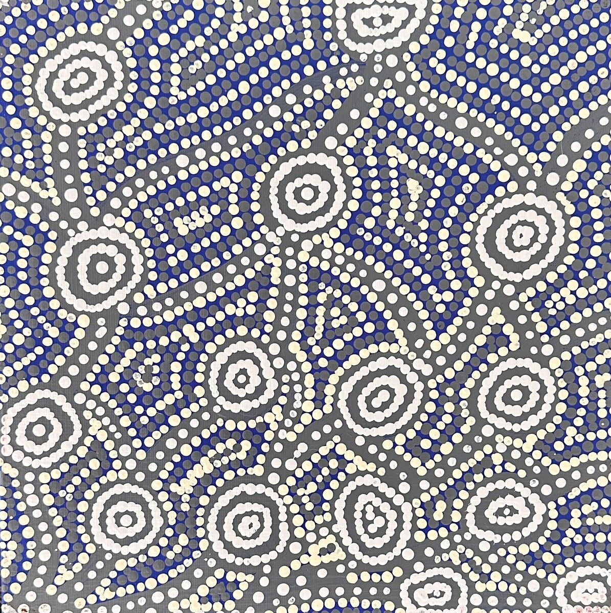 In contemporary Warlpiri paintings, traditional iconography can be used to represent the Jukurrpa, particular sites, and other elements. In paintings of this Jukurrpa, the group of women is often represented by concentric circles and ‘U’ shapes. Concentric circles can also illustrate ‘wardapi’ holes and the droppings they leave, while ‘wardapi’ tracks are usually represented by ‘W’ shapes.