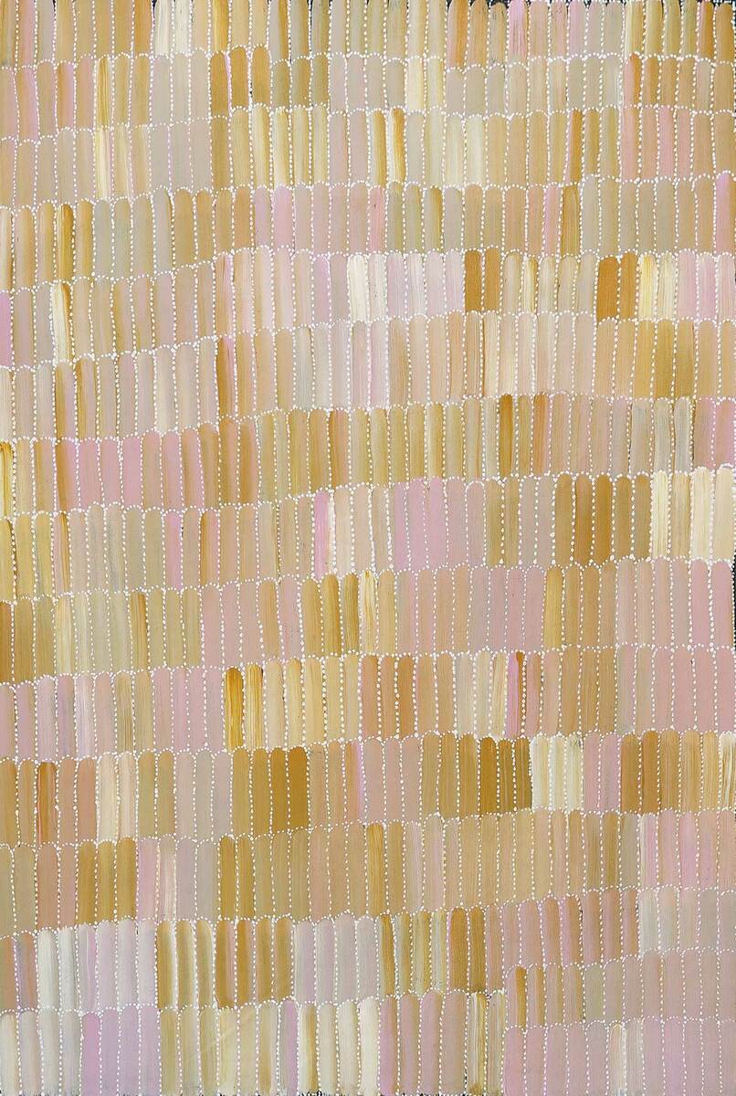 Jeannie Mills Pwerle works with an abstract set of colours, refining her images over many, many years to create a highly abstracted form of painting. Her works can incorporate hundreds of linear shapes representing Bush Yams that abound in colour, and with each shape outlined with a row of white dots. This painting represents the flower and seeds of the Anaty which Jeannie loves to collect. Jeannie was born in 1965 & has been painting Anaty since 2004.