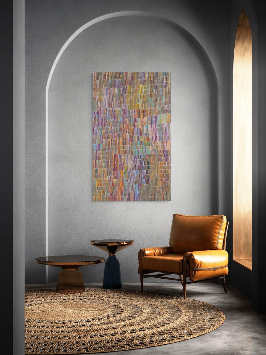 Jeannie paints the Anaty (Desert Yam or Bush Potato, Ipomoea costata) story from her father’s country, Irrweltye. This yam grows underground with its viny shrub growing above ground up to 1metre high. It is normally found on spinife sand plains and produces large pink flowers after summer rain. The anaty is a tuber, or swollen root, of the shrub and tastes much like the common sweet potato. It can be eaten raw or cooked and is still a staple food for the desert aborigines where it can be harvested at any time of the year. Some can be found as big as a person’s head. In this painting, Jeannie depicts the seed of the anaty (dot work), and the anaty flower (brush work and beautiful colours).