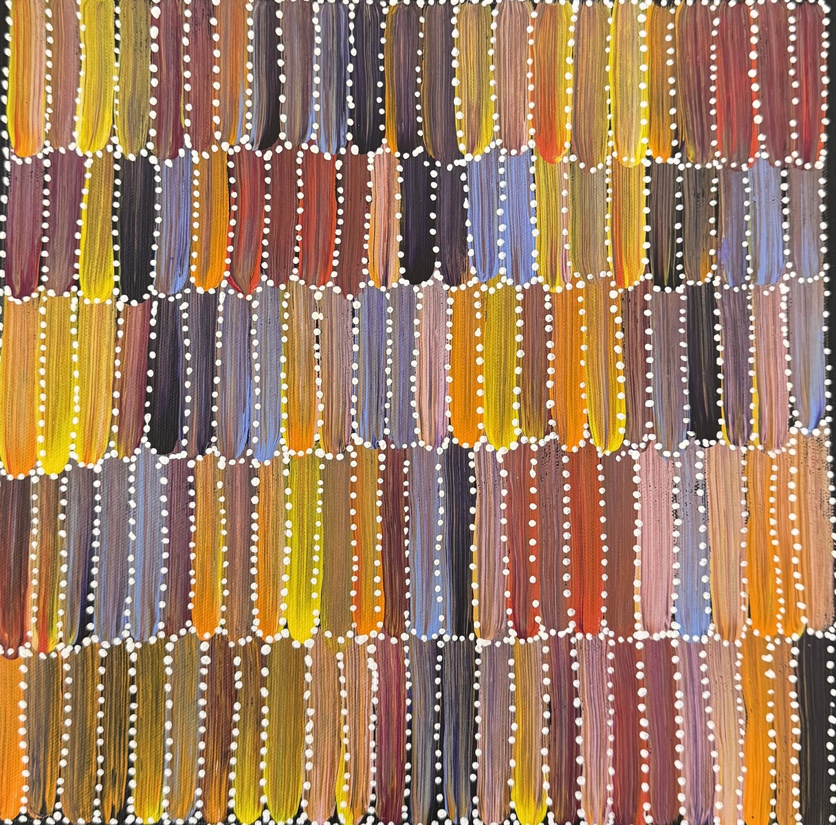 The linear work in this painting represents the yam and flower, and the dots represent the yam seed.