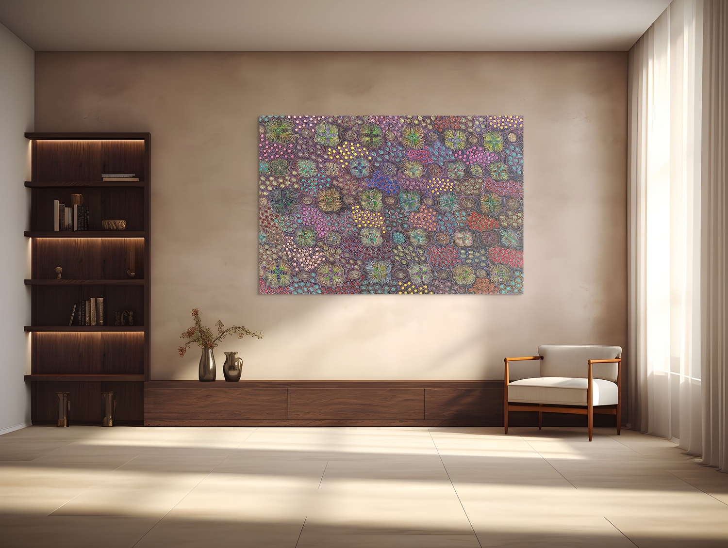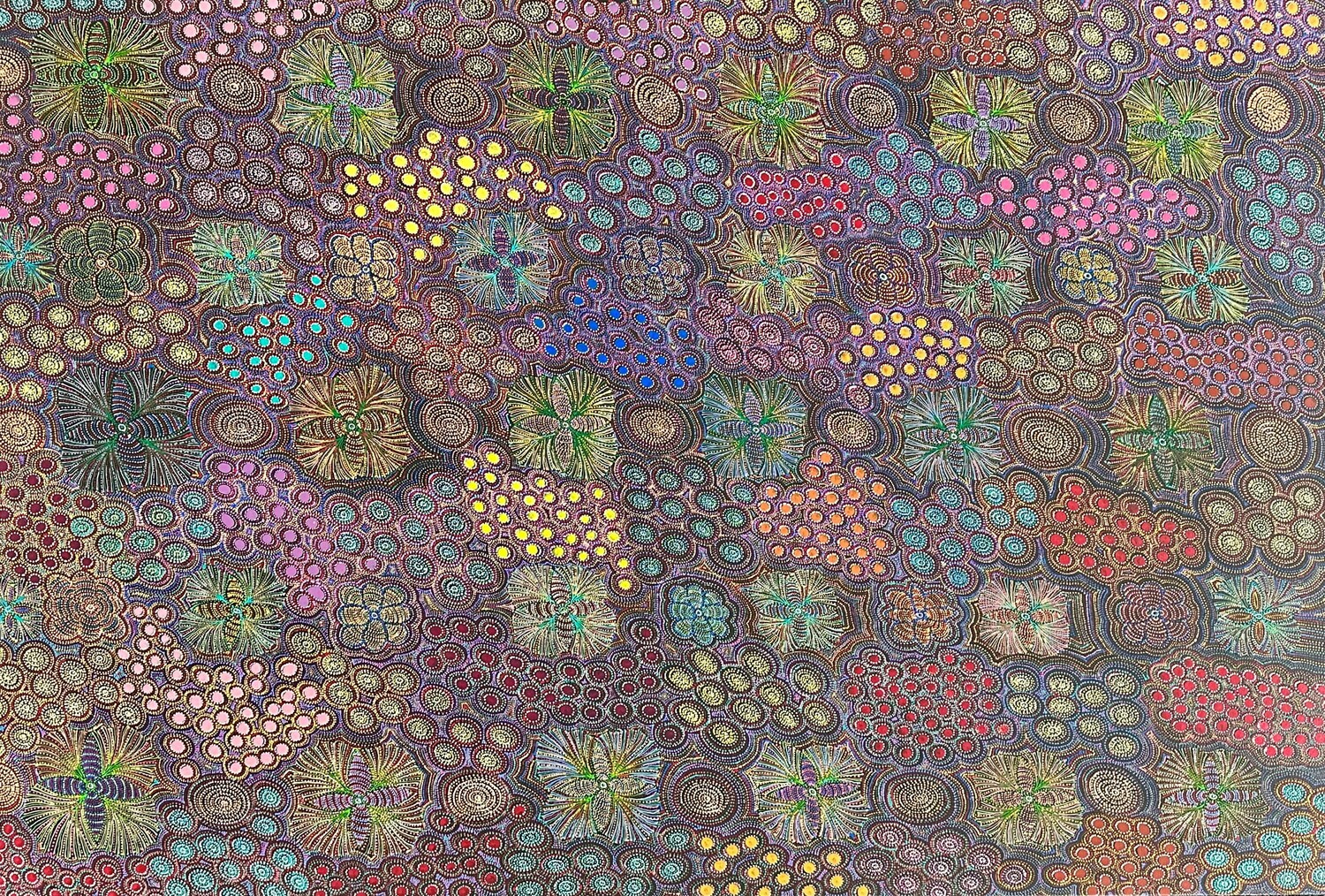Jessie’s painting represents awelye (women’s ceremony and body paint designs) for sugarbag. Sugarbag is bush honey of Australian native bees. Bush honey can be found in the trees in her country.