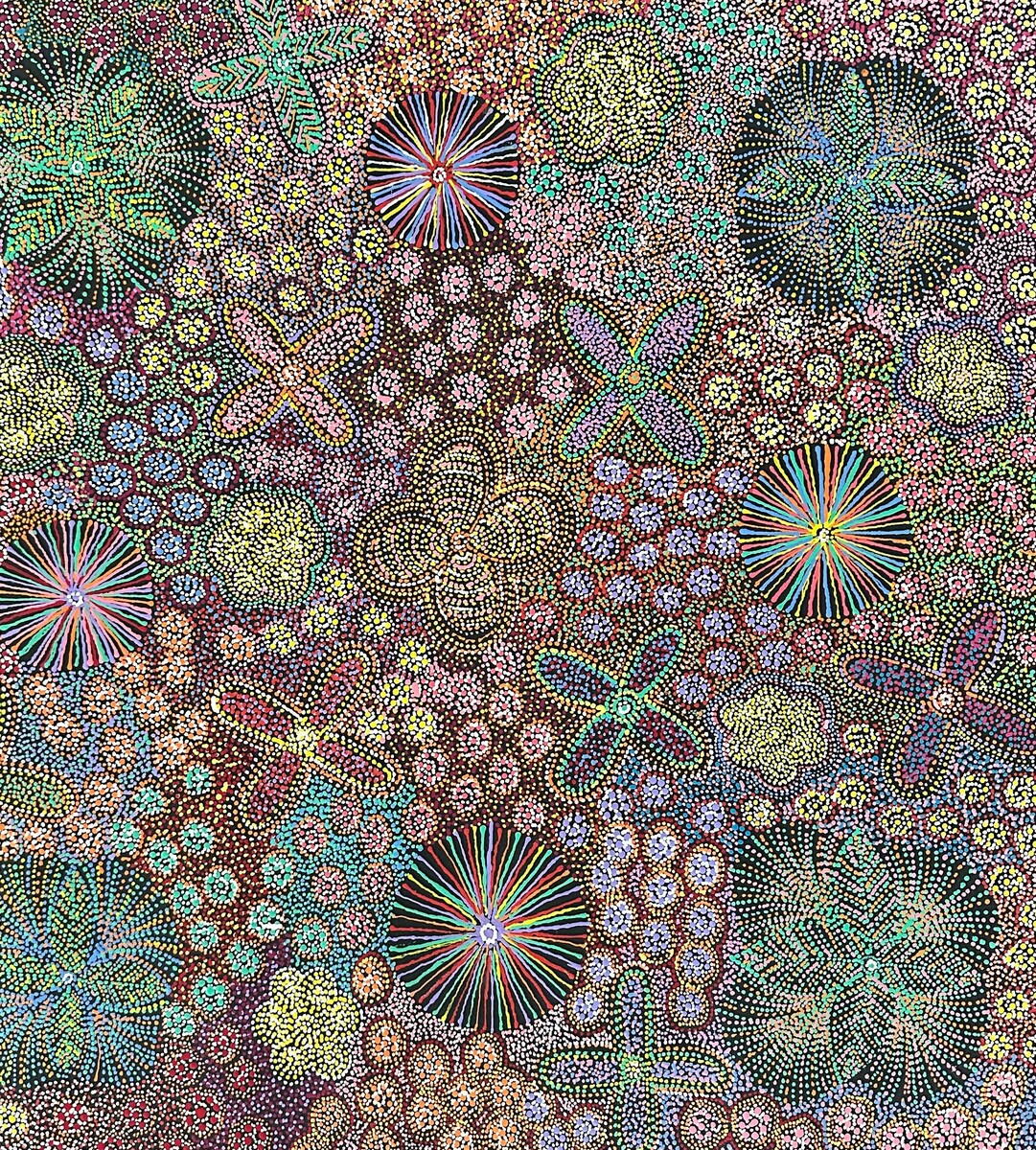 Jessie’s painting represents awelye (women’s ceremony and body paint designs) for sugarbag. Sugarbag is bush honey of Australian native bees. Bush honey can be found in the trees in her country.