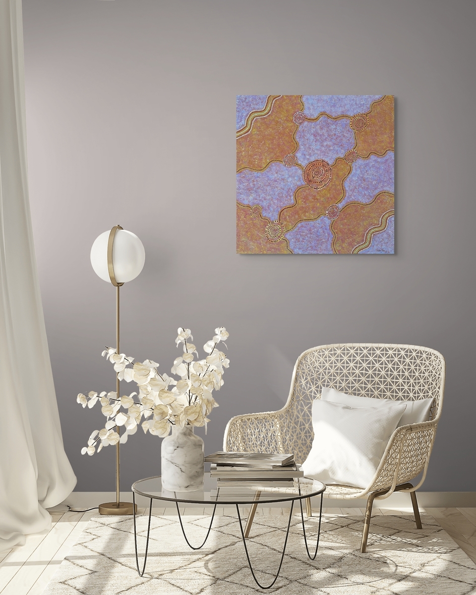 This painting depicts the upper Fortescue Marsh — the father’s Country of John Sara, Banyjima Country in the Pilbara region of north-western Australia. The circles within the painting symbolise places of historical and cultural significance connected to his family’s identity.