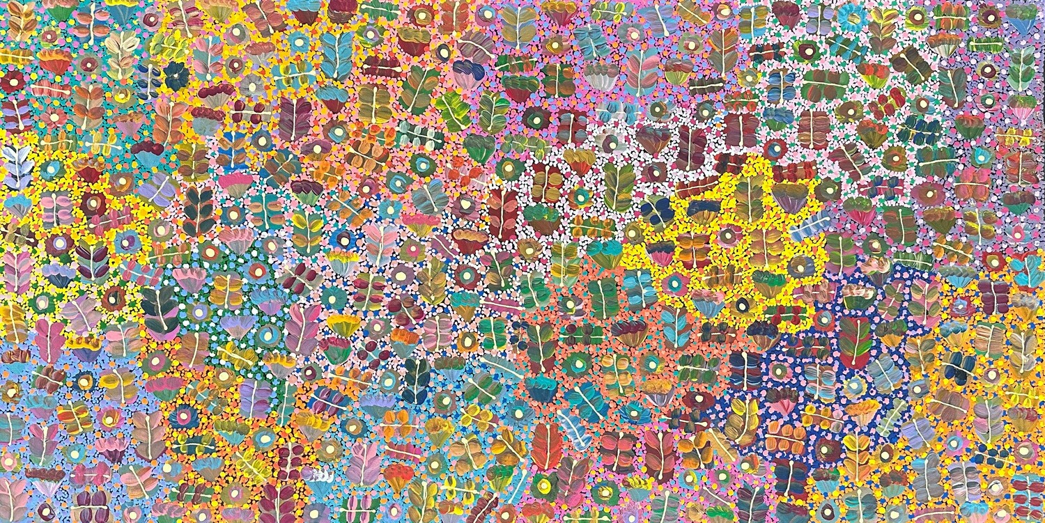 There are many sacred Dreamtime stories that belong to Joycie’s country of which play a significant part in her ceremonies and culture. One of her main Dreamings is the story of Bush Medicine which she has depicted in this painting.