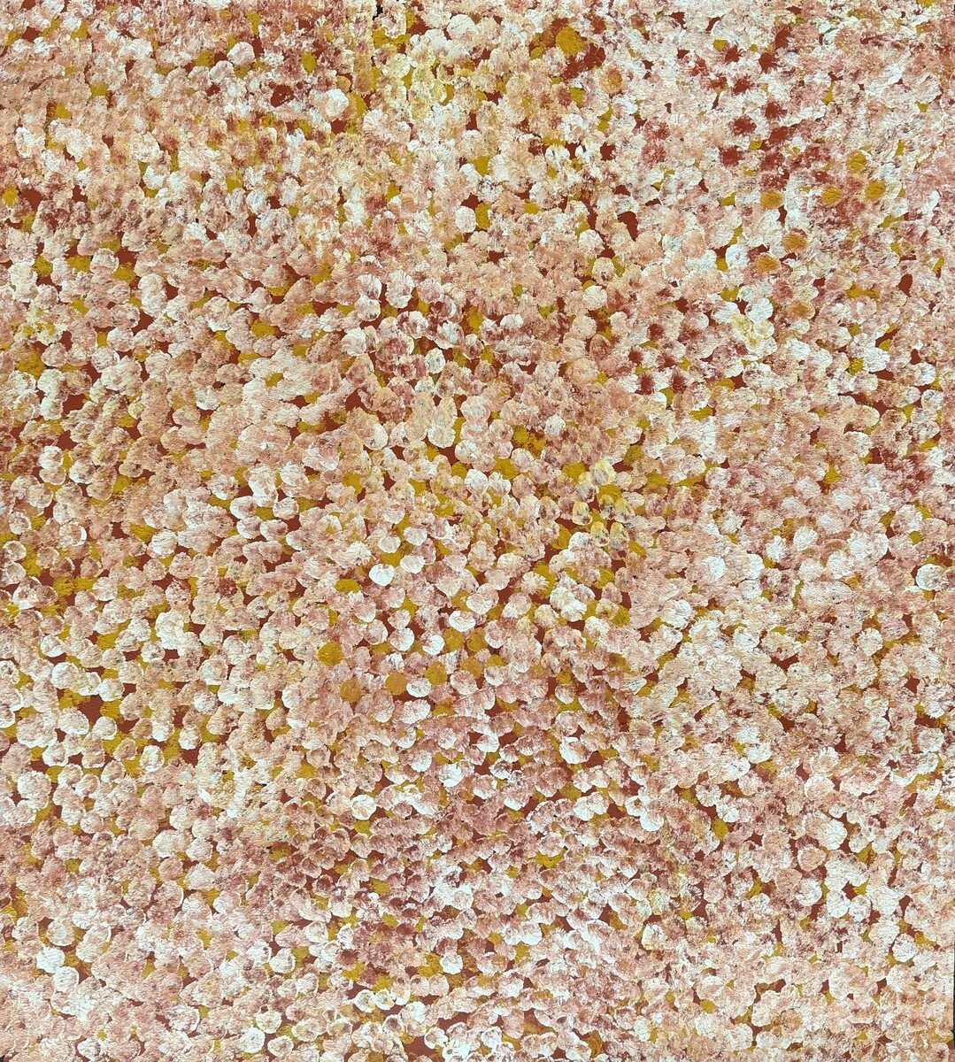 Katie paints the conkerberry (dot work). In Anmatyerre the conkerberry is called anwekety. This fruit looks very similar to a plum and is often referred to in English by Katie as a ‘bush plum’. In the Dreamtime, winds blew from all directions, carrying the anwekety seed over Katie’s ancestors’ land. The first anwekety of the Dreamings then grew, bore fruit and dropped more seeds. Many winds blew the seeds all over the Dreaming lands.