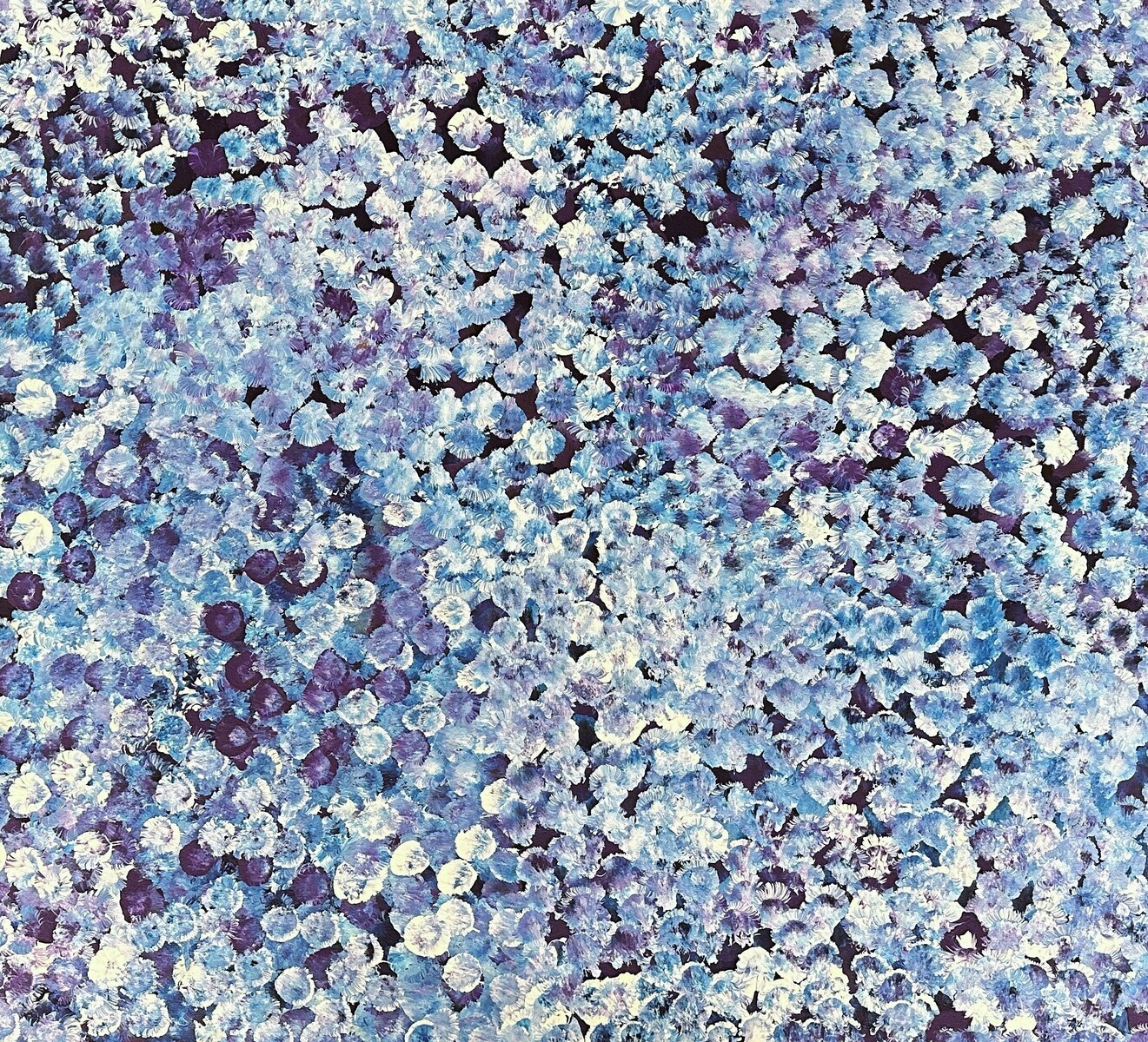 Katie paints the conkerberry (dot work). In Anmatyerre the conkerberry is called anwekety. This fruit looks very similar to a plum and is often referred to in English by Katie as a ‘bush plum’. In the Dreamtime, winds blew from all directions, carrying the anwekety seed over Katie’s ancestors’ land. The first anwekety of the Dreamings then grew, bore fruit and dropped more seeds. Many winds blew the seeds all over the Dreaming lands.