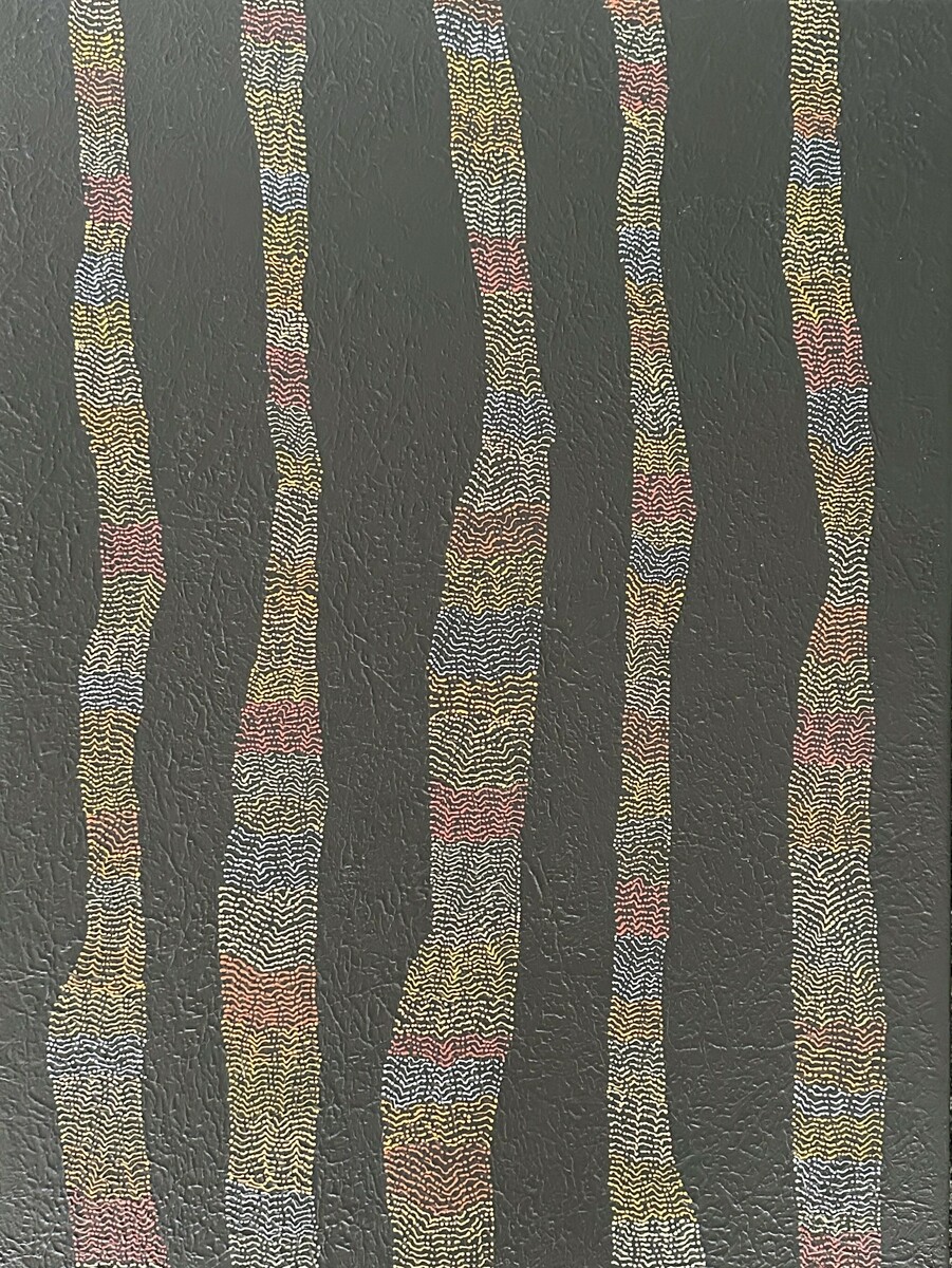 This painting is of the blackened trees after Kaarla (fire) has been through Boodja (country). The colours reflect the Banksia, Acacia, Hakea and Eucalyptus trees in Noongar bushland. In Noongar culture, fire holds profound significance, serving as a tool for land management, cultural practice and hunting. Cultural burning managed the landscape, clearing undergrowth for easier movement, promoting growth of certain plants and reduce the risk of large uncontrolled wildfires. Kaarla is essential for cooking, warmth and a focal point for storytelling, sharing traditions and cultural knowledge.
