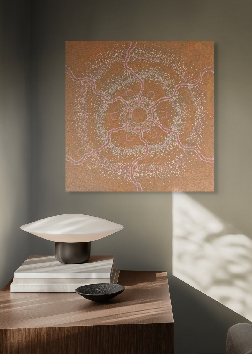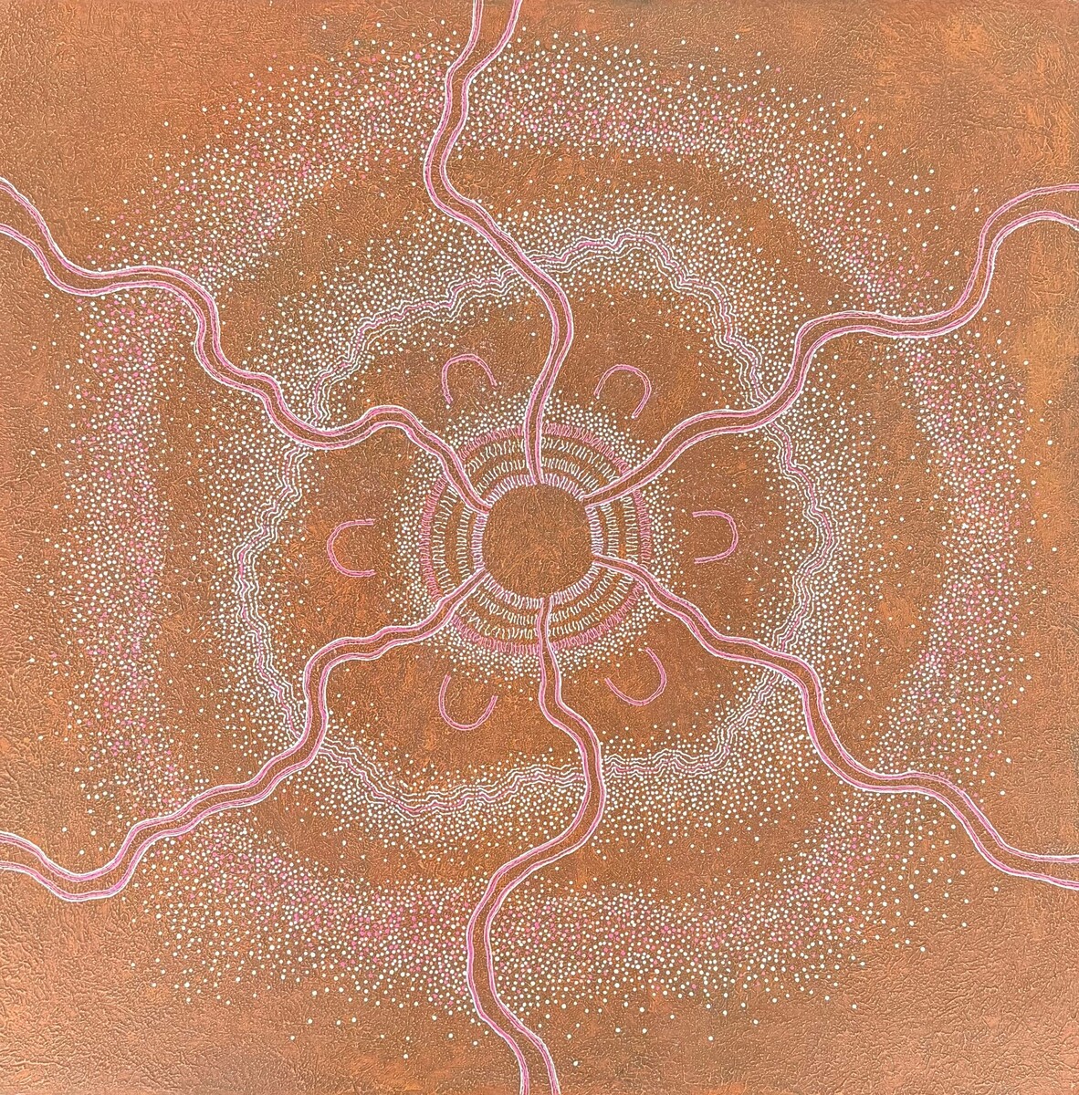 In this painting I reflect on the meeting of Aboriginal people on Country. Coming together over thousands of years and coming together now, to celebrate our history and our future.