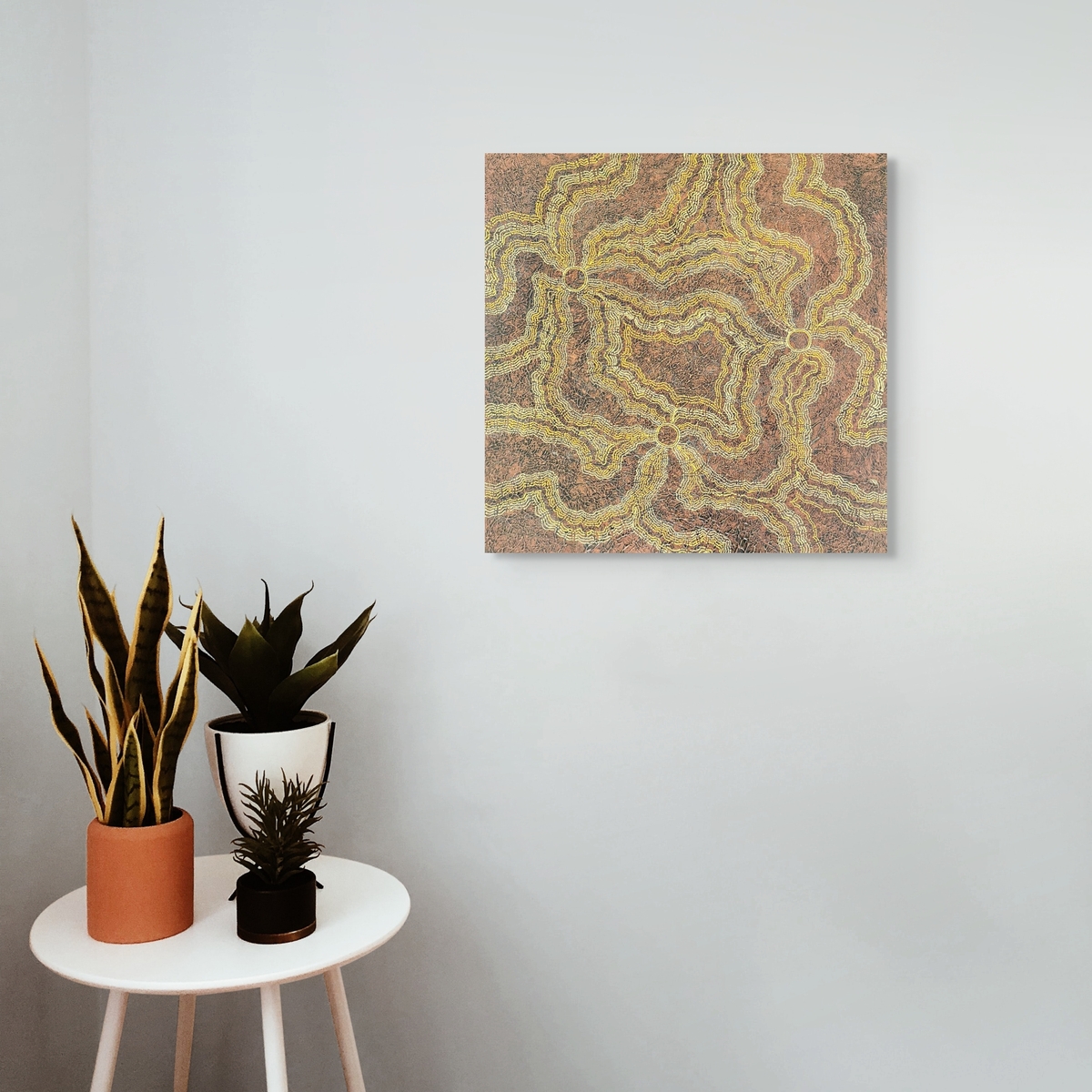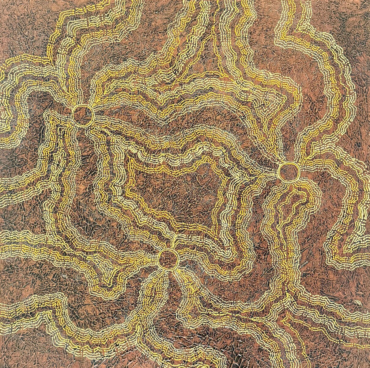 The circles within the painting represent meeting places. They are a place to stop and set up camp, share knowledge, ceremony and traditions. The bands linking the circles represent the ancient pathways used for thousands of years. For seasonal migration, trade routes, and animal tracks. These trails often follow songlines that link landmarks, resources, water sources and dreamtime stories.