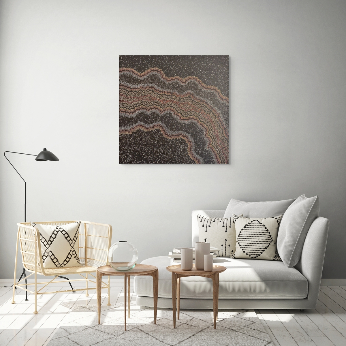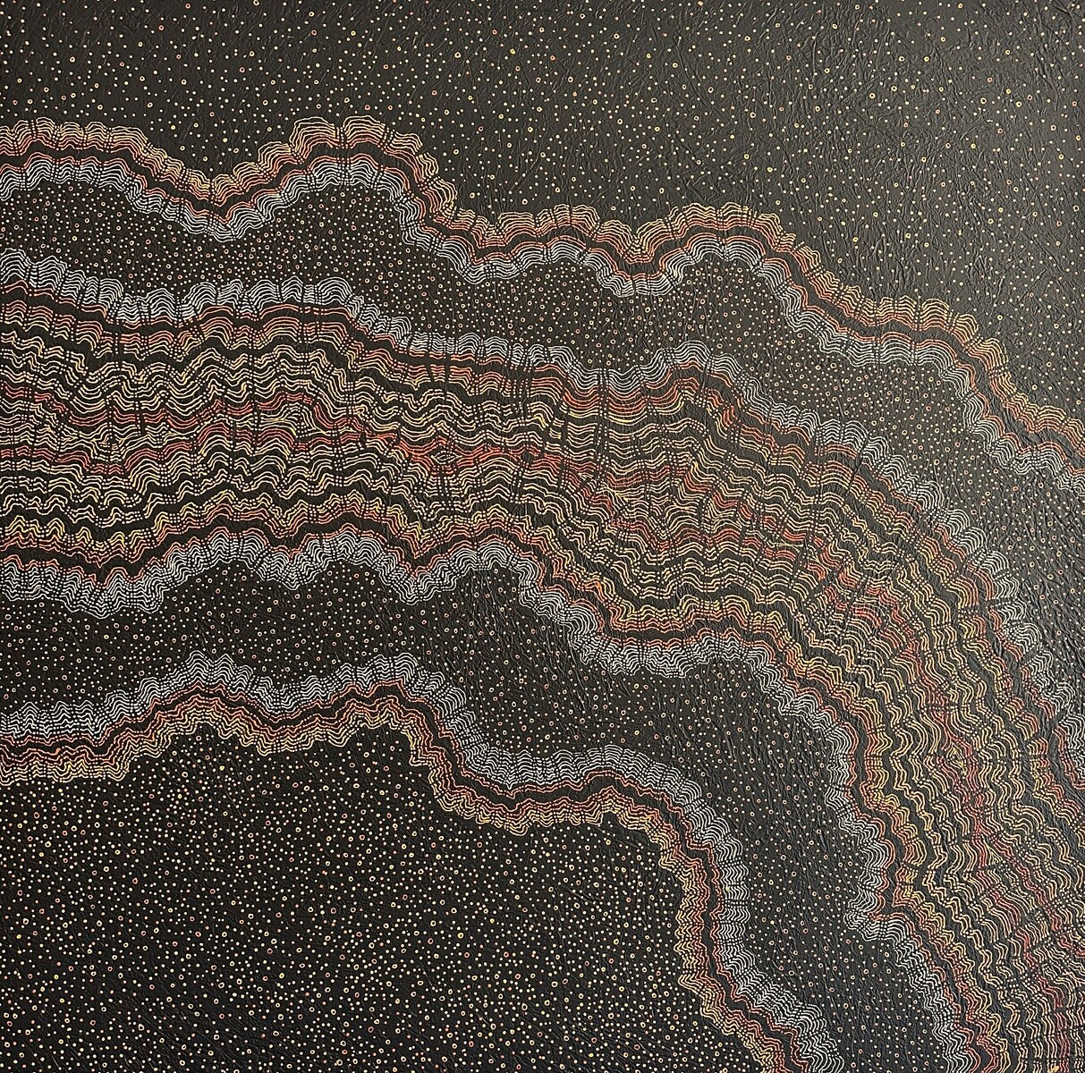 The Moodjar tree (WA Christmas tree) is called the Tree of Souls by Noongar people. It is distinguished by its spectacular orange and yellow blossoms that carry profound cultural meaning. This sacred and powerful tree holds the souls of the recently departed, serving as a resting place before heading to the afterlife. The Noongar people consider the Moodjar sacred, knowing it has held our ancestors’ spirits within its branches. This wavy bands in this painting represents the canopy of the tree, where the spirits rest. The dots along the top of the painting represent the spirits being blown by the wind to the afterlife.