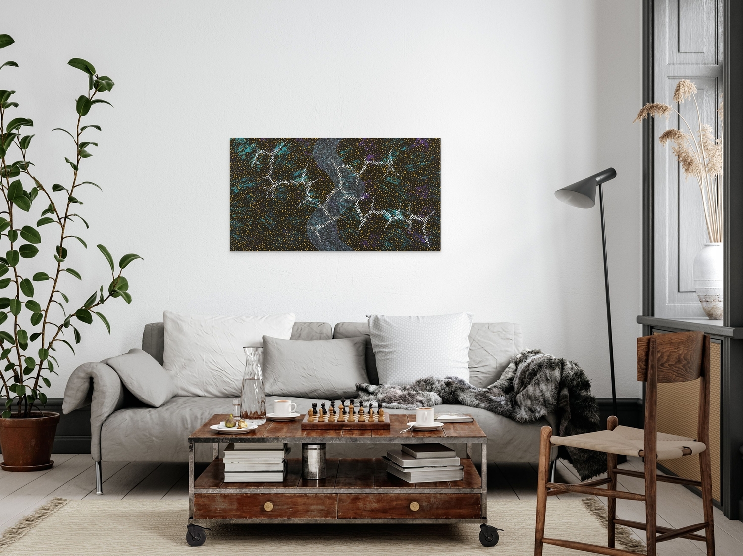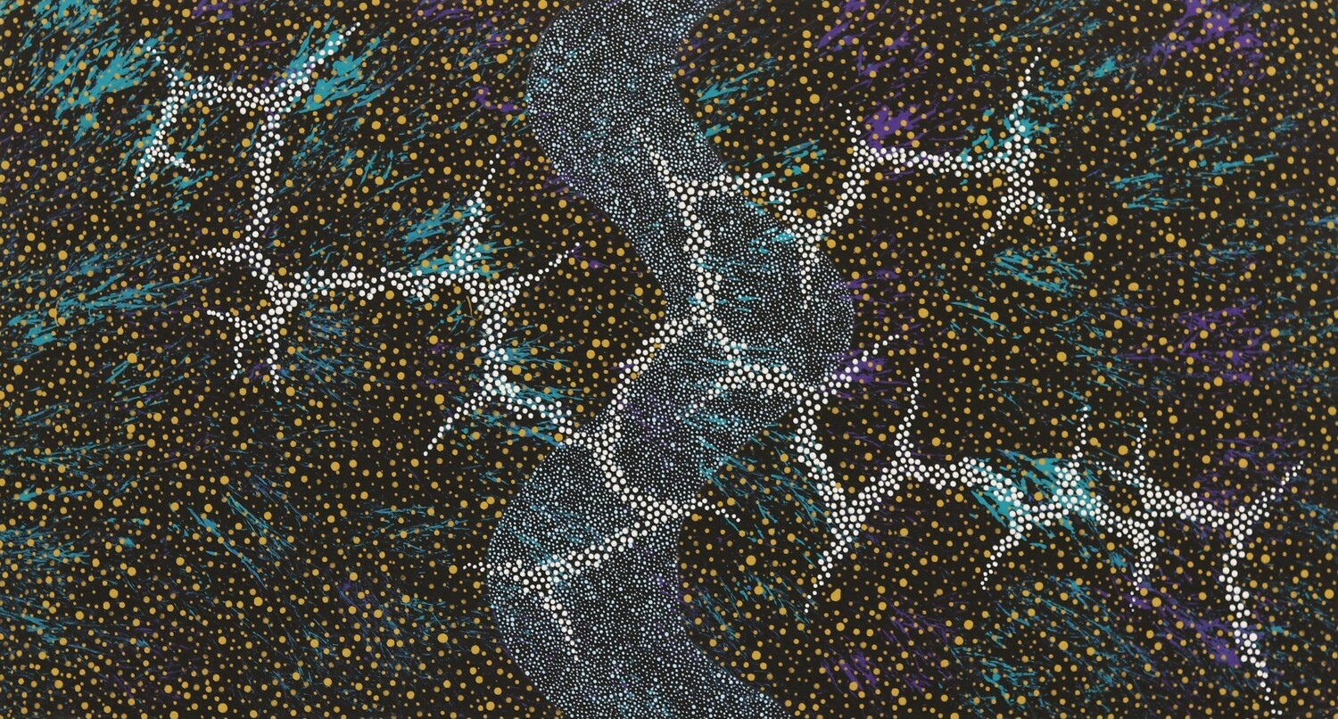 Kyra Campbell is an artist who is most recognized for her intricate representations of the sacred Claypan and Lightning Dreaming stories of her Country at night. Kyra is inspired by her ancestral spirits, who live within the land and the sky, protecting all of the members of her community.