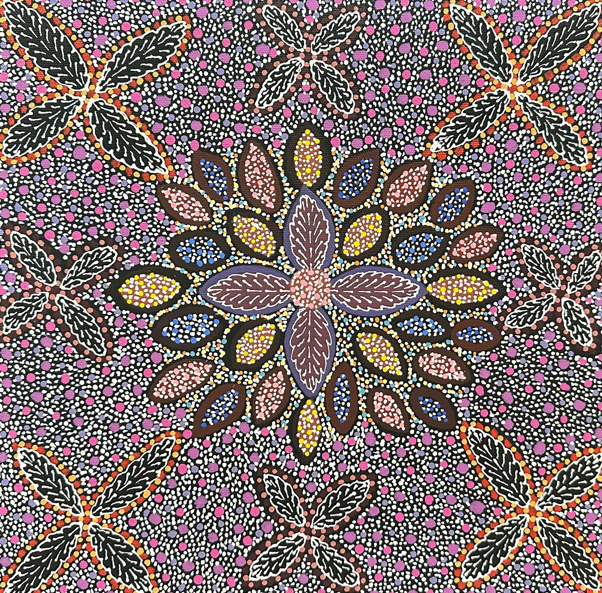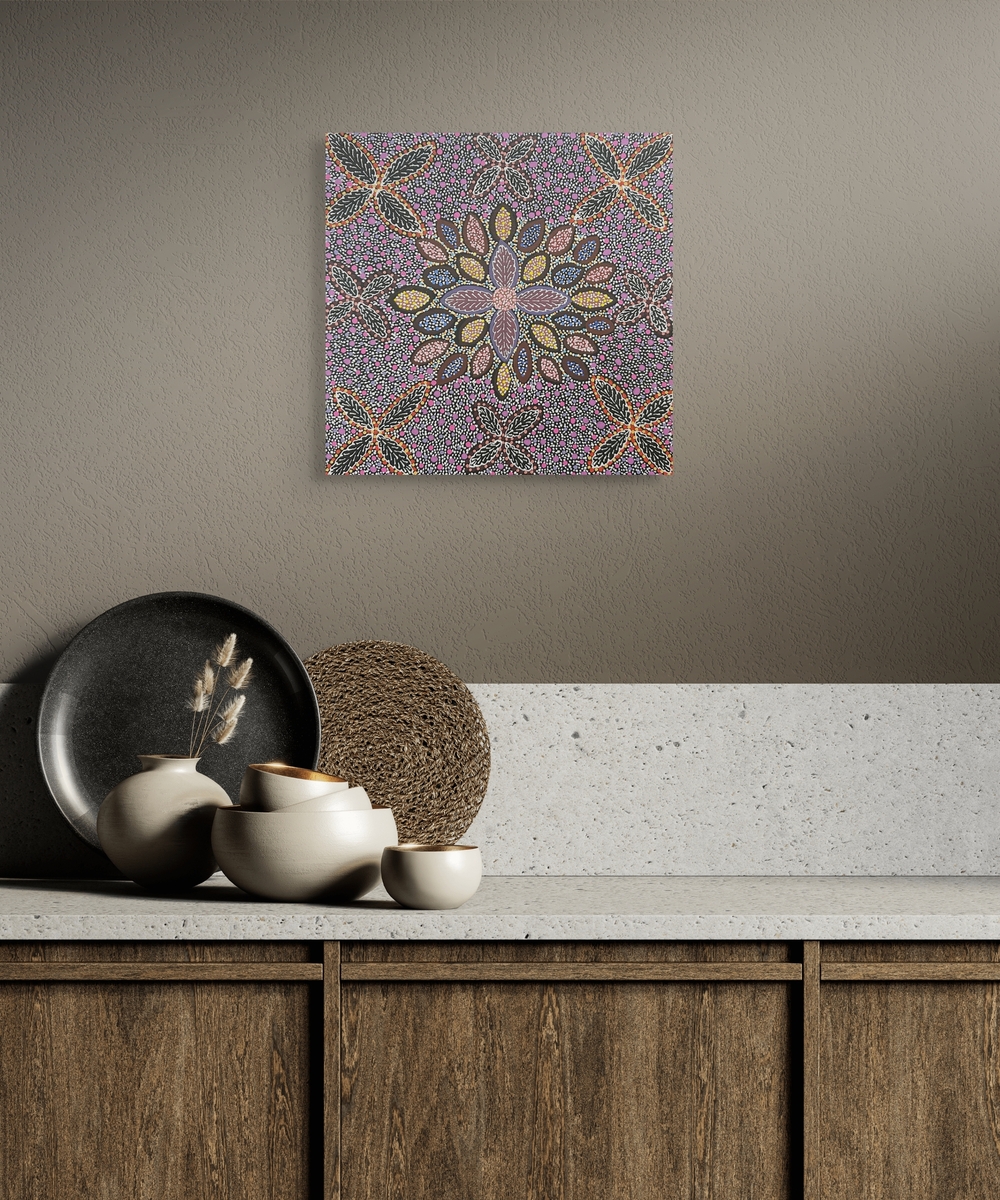 All of Lily’s Dreamtime stories belong to her country, Ngkwarlerlaneme and Arnkawenyerr. This painting is inspired by the Dreamtime story of the Ilyarn or Ilyarnayt, a rare and attractive plant growing throughout Central Australia.