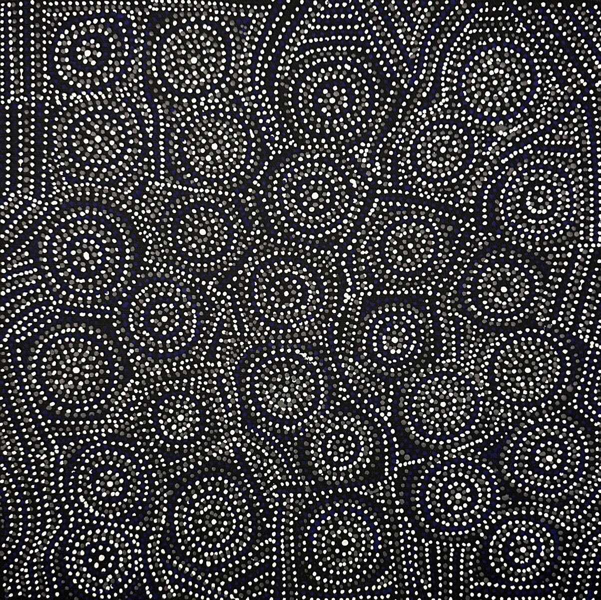 Lizzie paints the story of the northern wild oranges, known as Akarley in Lizzie’s language. The wild oranges hang down on long stalks, turning yellow or a red tint when ripe, most commonly during the month of February. Young fruit are often ripened in hot sand.