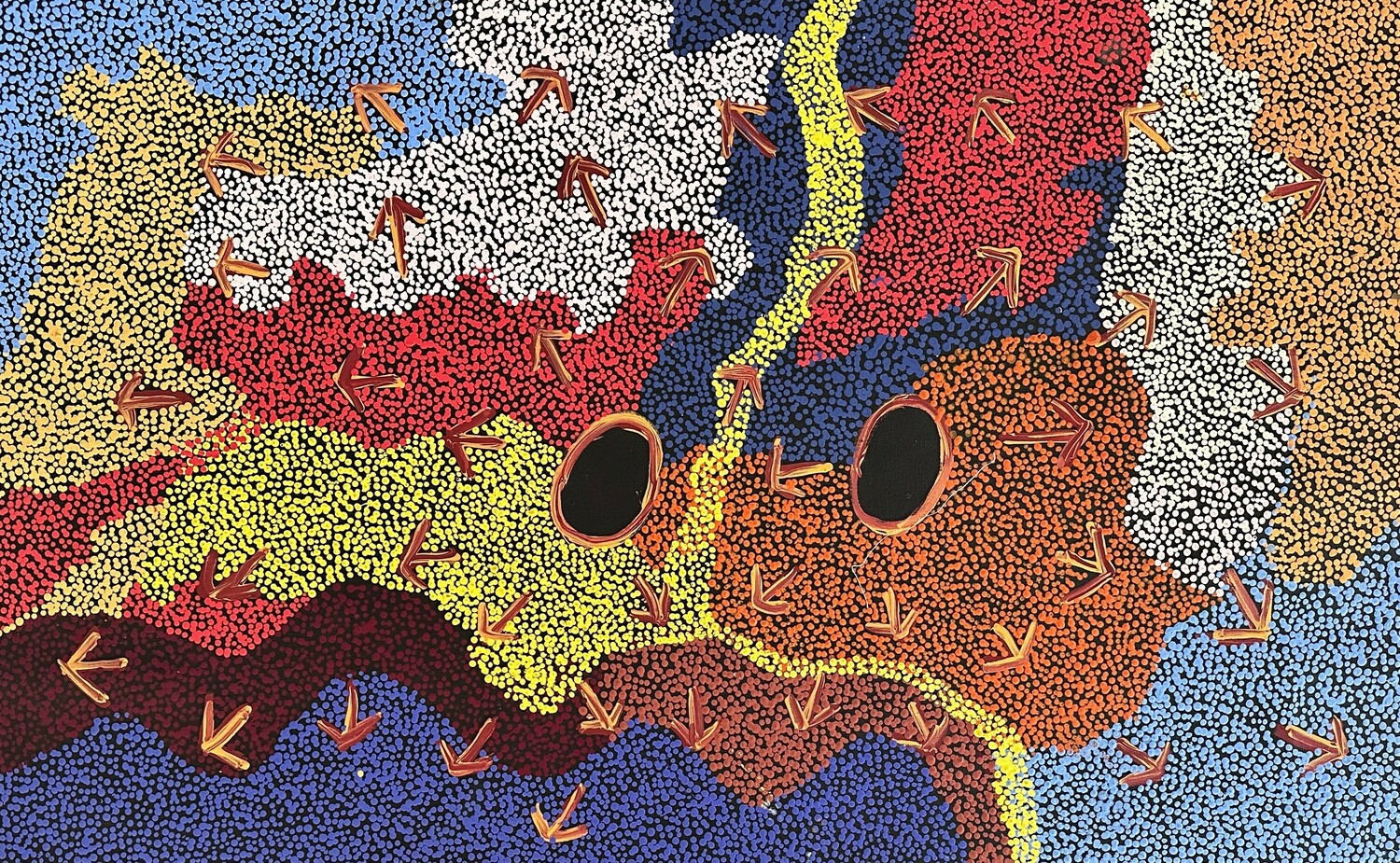 In contemporary Warlpiri paintings, traditional iconography can be used to represent the Jukurrpa, associated sites, and other elements. ‘Yankirri’ are usually represented by arrow-like shapes depicting their ‘wirliya’ (footprints) as they walk around.