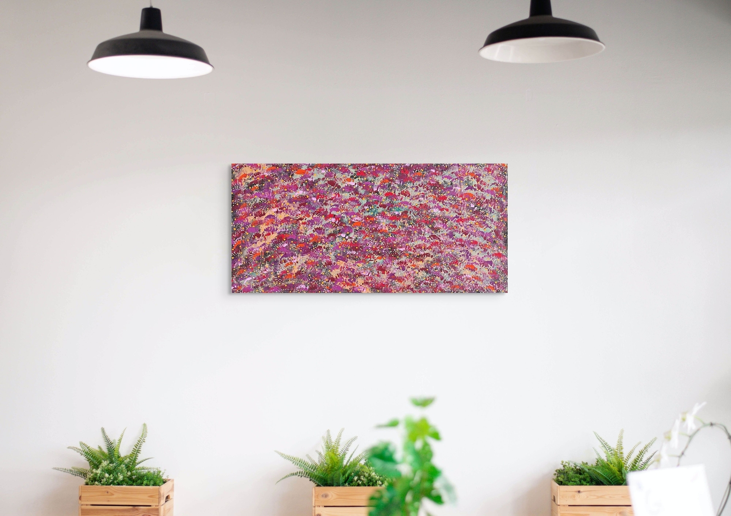 “These are the beautiful wildflowers of my country. The mulla mulla flowers carpet the ground and the lovely bluebells, blue gum and spinifex grow amongst them. They blend so perfectly with the orange colour of the earth peeking through.” Melissa Sandy was born in Port Hedland and lives in Roebourne. Melissa’s mother’s Country surrounds the Millstream Tablelands, while her father hails from Adelaide.
