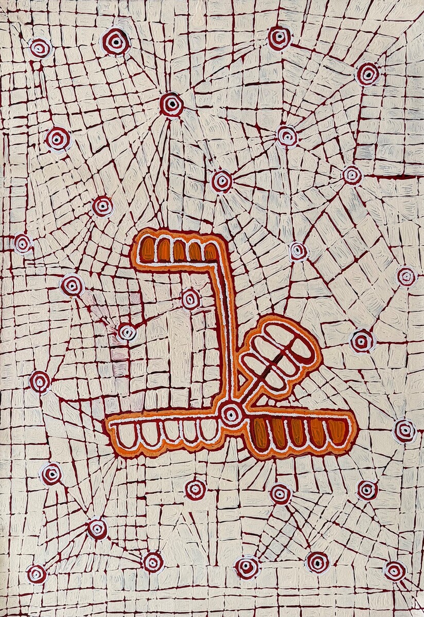 This painting tells the story of a Jangala ‘watiya-warnu’ (Acacia tenuissima) ancestor who travelled south from a small hill called Ngurlupurranyangu to Yamunturrngu (Mount Liebig). As he travelled he picked the ‘watiya-warnu’ seeds and placed them in ‘parrajas’ (food carriers), one of which he carried on his head. Watiya-warnu is a seed bearing tree that grows in open spinifex or mulga country. When people returned to their camp after collecting the seeds they would make large windbreaks for shelter and winnow the seed in the late afternoon. Immature ‘watiya-warnu’ seed is ground into a paste and can be used to treat upset stomachs. The associated ‘watiya-warnu’ ceremony involves the preparation of a large ground painting. This Jukurrpa belongs to Nampijinpa/Nangala women and Jampijinpa/Jangala men. In contemporary Warlpiri paintings traditional iconography is used to represent the Jukurrpa, particular sites and other elements. In paintings of this Dreaming ‘U’ shapes are often depicting women collecting the ‘watiya-warnu’ seeds. Oval shapes represent the ‘parrajas’ where they carry the seeds and strait lines beside them frequently portrait digging sticks.