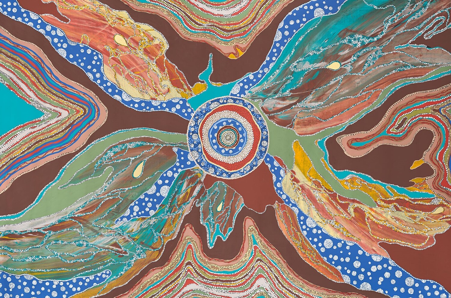 Observing the land as it moves, dances, flusters, and strives to connect with all living beings is a profound aspect of Dreamtime memory. A rich tapestry of existence revealing the essence of knowing a deep understanding of our place within the natural world. The vibrant colours of the country, the flowing contours of rivers, and the myriads of all living beings are intricately intertwined, forming a harmonious network that breathes life into every landscape. The shimmering hues of mother earth reflect the vitality of nature, while the rhythms of the rivers resonate with the pulse of life. In this dynamic interplay, every facet plays a vital role, reminding us of our shared existence and the importance of nurturing connections. Together, they create a beautiful symphony of life, echoing the wisdom of our past and the promise of a sustainable future.
