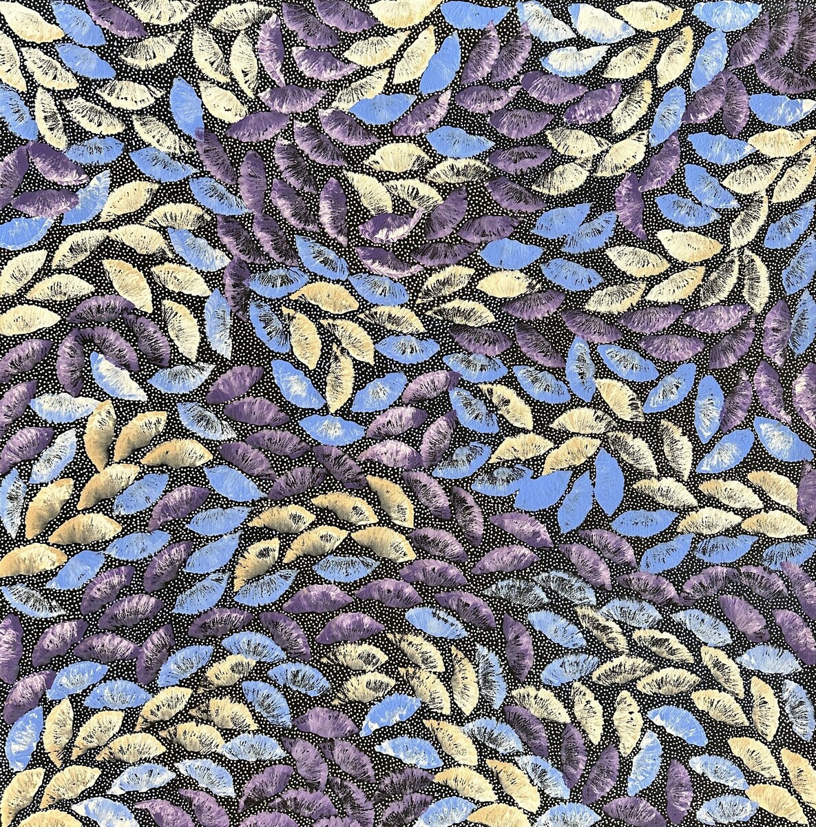 Selina has painted spinifex that she can find in her country, Antarrengeny in Utopia region. Spinifex, or aptly named the porcupine grass, is a sharp pointed grass that is abundant in central Australia.