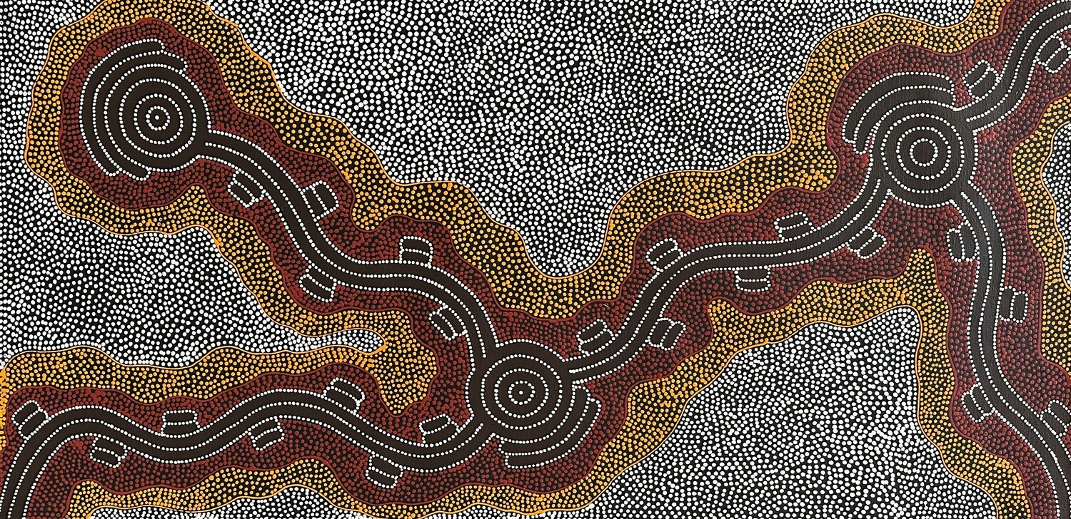 The Yarla Jukurrpa (bush potato [Ipomea costata] Dreaming) tells the story of a fight between ‘yarla’ from Yumurrpa and ‘wapirti’ (bush carrot [Vigna lanceolata]) from Wapurtali. The ‘yarla’ were Jakamarra/Jupurrurla skins and they were in conflict over Napaljarri/Napanangka women, who have the right skin for marriage. The fight took place at ‘Ngardirpi. Many men died, their bodies are now sand hills and their blood formed a water soak. ‘Yarla’ are fibrous tubers that grow beneath a low spreading plant, found by looking for cracks in the ground. Yarla are good to eat, when cooked they are really soft and tasty. This Dreaming belongs to Jupurrurla/Jakamarra men and Napurrula/Nakamarra women. Nakamarra and Napurrula ‘karnta’ (women) are shown sitting down at Yumurrpa gathering ‘yarla’ with ‘karlangu’ (digging sticks) and placing them in ‘parraja’ (wooden carrying dishes). In contemporary Warlpiri paintings traditional iconography is used to represent the Jukurrpa, associated sites and other elements. In paintings of this Jukurrpa women are usually depicted by ‘U’ shapes while the ‘yarla’ plants are represented by concentric circles. The ‘watarlapi’ (the lateral ‘yarla’ roots) are shown across the painting, to symbolize the way this Jukurrpa is spread through Warlpiri country.