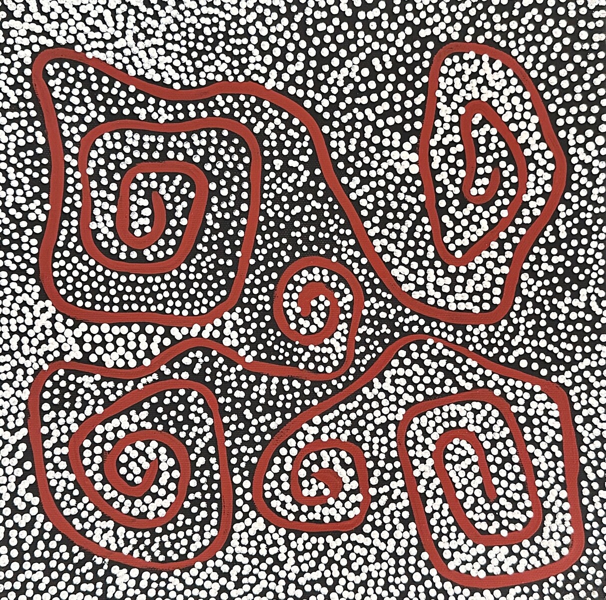 The Yarla Jukurrpa (bush potato [Ipomea costata] Dreaming) tells the story of a fight between ‘yarla’ from Yumurrpa and ‘wapirti’ (bush carrot [Vigna lanceolata]) from Wapurtali. The ‘yarla’ were Jakamarra/Jupurrurla skins and they were in conflict over Napaljarri/Napanangka women, who have the right skin for marriage. The fight took place at ‘Ngardirpi. Many men died, their bodies are now sand hills and their blood formed a water soak. ‘Yarla’ are fibrous tubers that grow beneath a low spreading plant, found by looking for cracks in the ground. Yarla are good to eat, when cooked they are really soft and tasty. This Dreaming belongs to Jupurrurla/Jakamarra men and Napurrula/Nakamarra women. Nakamarra and Napurrula ‘karnta’ (women) are shown sitting down at Yumurrpa gathering ‘yarla’ with ‘karlangu’ (digging sticks) and placing them in ‘parraja’ (wooden carrying dishes). In contemporary Warlpiri paintings traditional iconography is used to represent the Jukurrpa, associated sites and other elements. In paintings of this Jukurrpa women are usually depicted by ‘U’ shapes while the ‘yarla’ plants are represented by concentric circles. The ‘watarlapi’ (the lateral ‘yarla’ roots) are shown across the painting, to symbolize the way this Jukurrpa is spread through Warlpiri country.