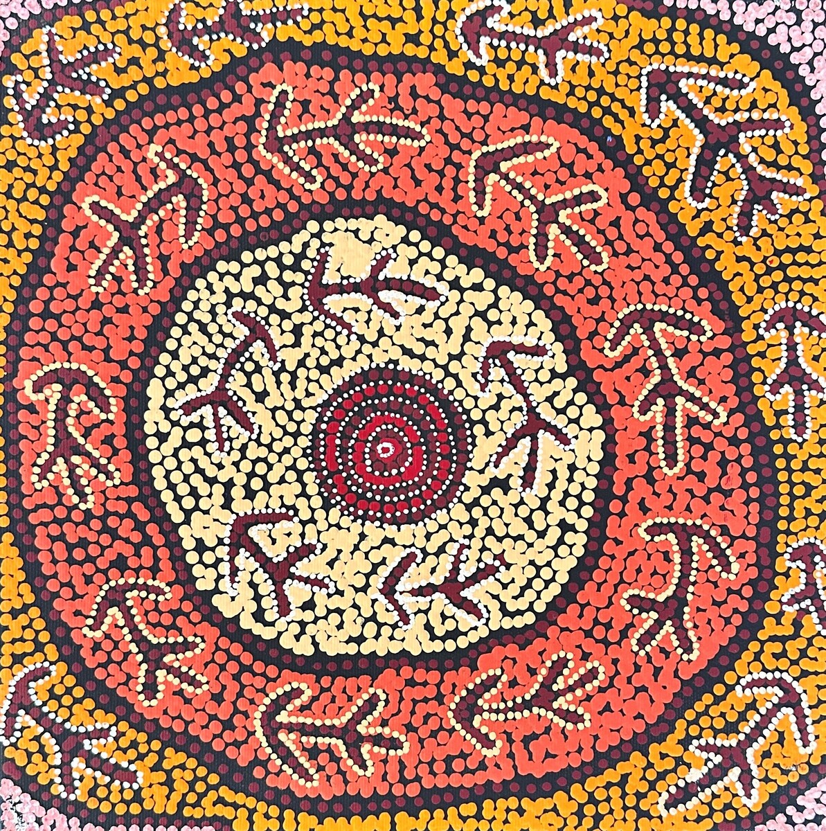 This Dreaming belongs to Warlukurlangu country to the south-west of Yuendumu, for which Jampijinpa/Jangala men and Nampijinpa/Nangala women have custodial responsibility. An old man ‘lungkarda’ (centralian blue-tongued lizard [Tiliqua multifasciata]), of the Jampijinpa skin group, lived on a hill with his two Jangala sons. The old man would feign blindness and send the two boys hunting in search of meat. While they were gone he would hunt and eat anything that he caught before they returned. One day the sons returned with a kangaroo that they had caught after much tracking. Unfortunately the kangaroo was sacred to the ‘lungkarda’, unbeknown to the boys. In his anger the old man decided to punish his sons and the next time they went out, he put his fire stick to the ground and sent a huge bush fire after them which chased them for many miles, at times propelling them through the air. Although the boys beat out the flames, ‘lungkarda’s’ special magic kept the fire alive and it re-appeared out of his blue-tongued lizard hole. Exhausted the boys were finally overcome by the flames. In contemporary Warlpiri paintings traditional iconography is used to represent the Jukurrpa, particular sites and other elements. Usually sites that are depicted in paintings of this Jukurrpa include Warlukurlangu (a men’s cave), Kirrkirrmanu (where the sacred kangaroo was killed), Wayililinypa (where the fire killed the two Jangala sons) and Marnimarnu (a water soakage) where the two Jangalas camped.