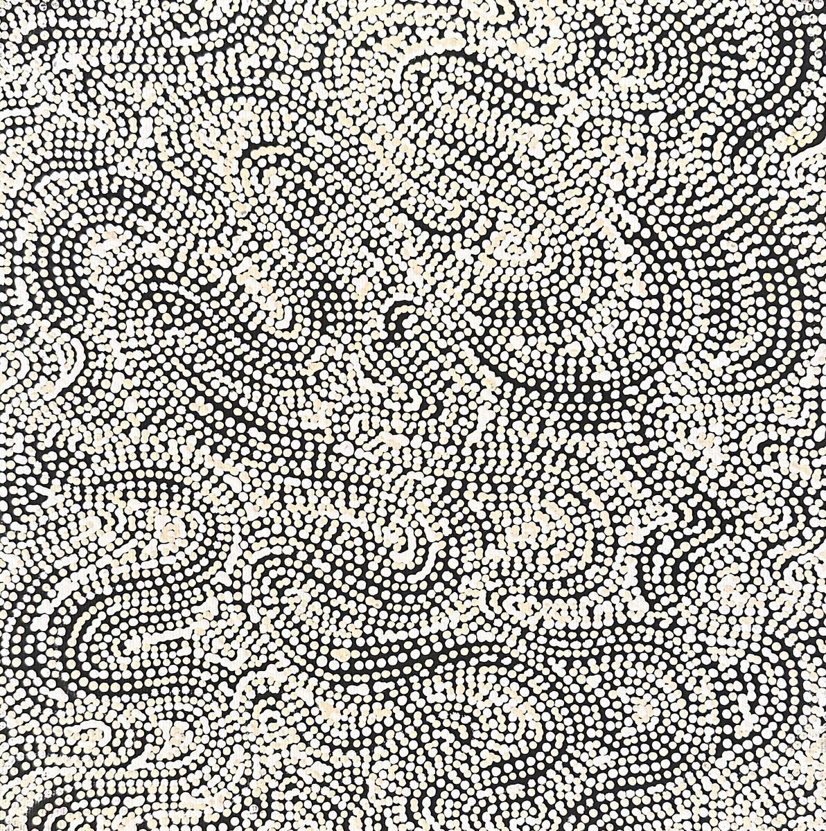 The ‘kirda’ (owners) of this country are Napangardi/Napanangka women and Japangardi/Japanangka men, who can depict portions of the Mina Mina Jukurrpa in their paintings. There are a number of different components of the Mina Mina Jukurrpa; artists usually choose to depict one particular aspect. These can include ‘karnta’ (women), ‘karlangu’ (digging sticks), ‘majardi’ (hairstring skirts/tassels), ‘ngalyipi’ (snakevine [Tinospora smilacina]), ‘jintiparnta’ (desert truffle [Elderia arenivaga]), and ‘kurrkara’ (desert oak [Allocasuarina decaisneana]).