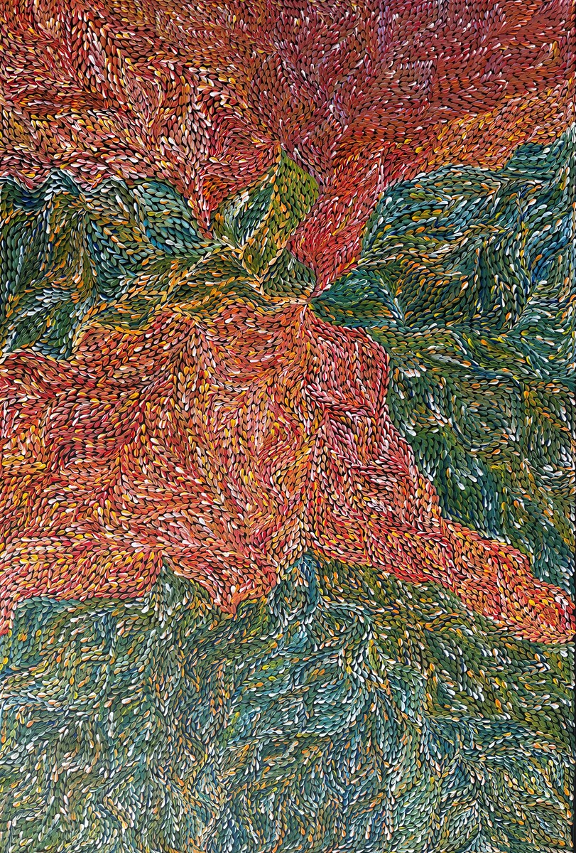 Violet paints the story of the wild tobacco or pituri (Nicotiana spp.). In Violet’s language it is called ngkwerlp. This herb has soft leaves and creamy white, trumpet shaped flowers with two-valved seed capsules. Occurring naturally in Central Australia, it is found plentiful in Violet’s home in the Utopia Region, northeast of Alice Springs. The leaf of the plant is picked and chewed by the aboriginal people and can also be used for medicinal purposes. In the olden days, and in some areas today, the seeds would be collected and replanted by the aboriginal people.